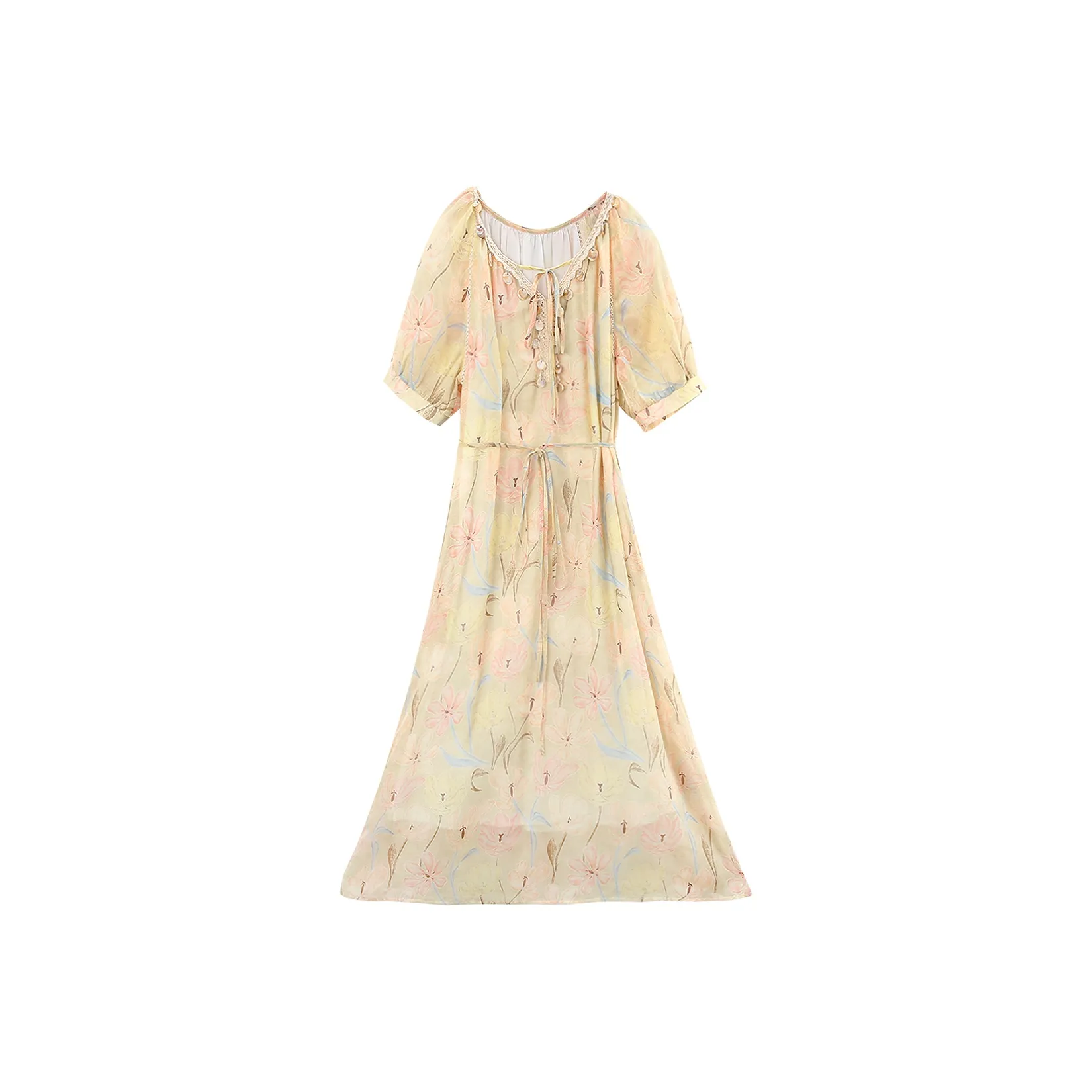 Платье с коротким рукавом от 'A paradise for awakening' с цветочным узором - это отличный выбор для куинсеанеры. Состав из различных тканей делает его легким и удобным, а высокие талии подчеркивают фигуру. Это платье подходит для весны и лета.