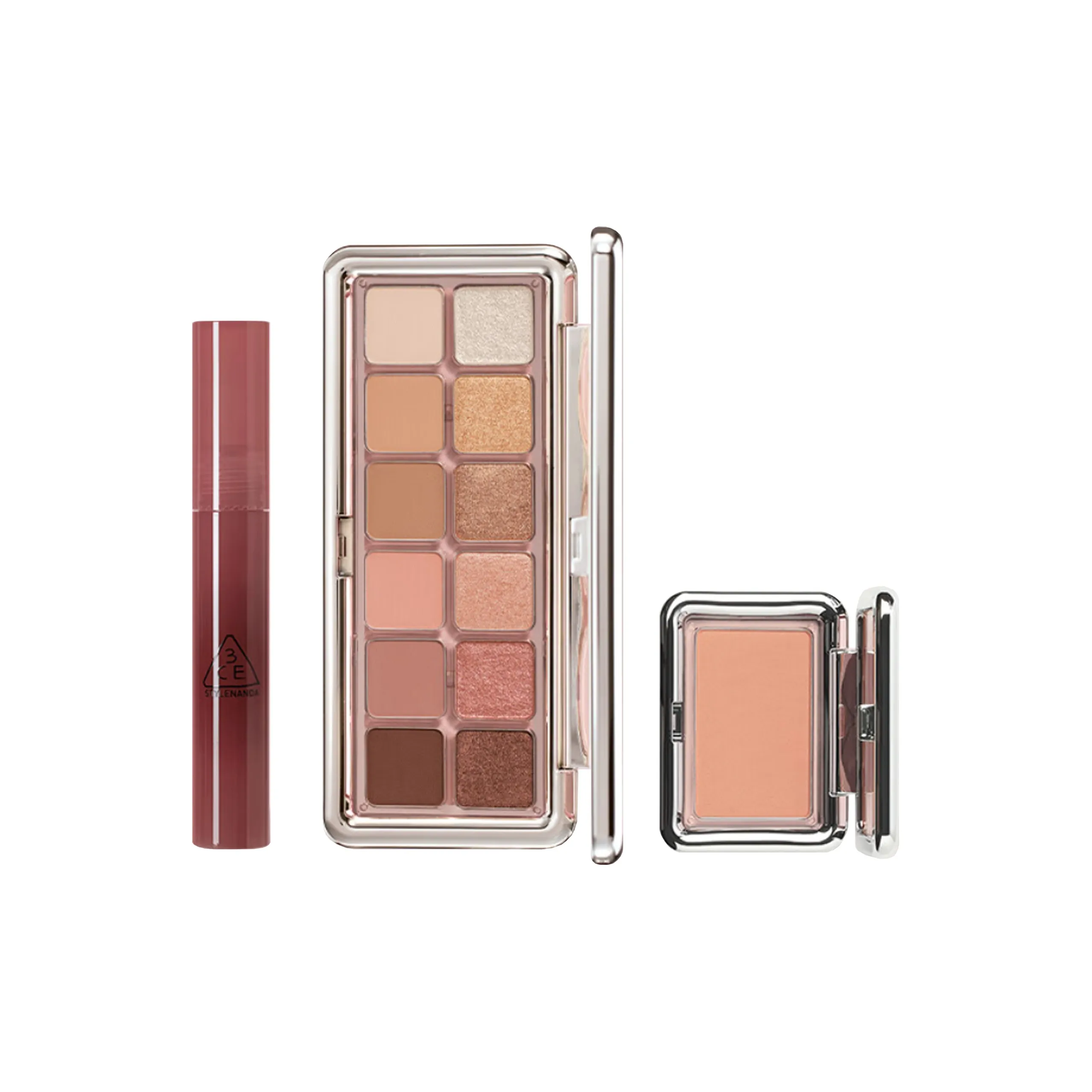 Набор 3CE включает в себя палитру теней, румяна и помаду, что делает его идеальным для создания гармоничного образа. Эти продукты легко смешиваются и наносятся, что позволяет быстро создать красивый макияж. Набор подходит для повседневного использования и особых случаев.