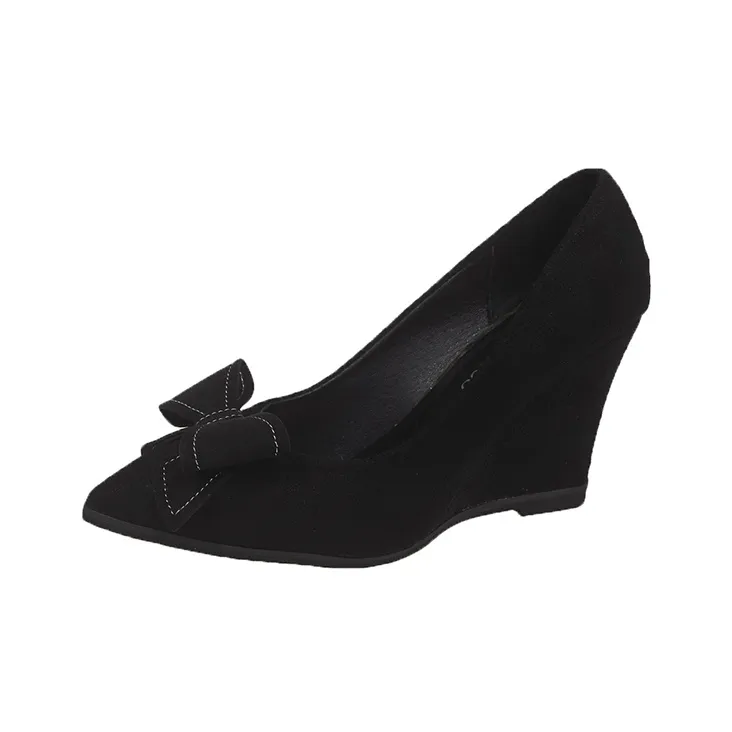 Туфли на танкетке WUJI с высотой каблука 9 см выполнены из замши и имеют резиновую подошву. Они имеют острый носок и стильный дизайн с элементами стежки. Эти туфли идеально подходят для весны и лета и доступны в классическом черном цвете.
