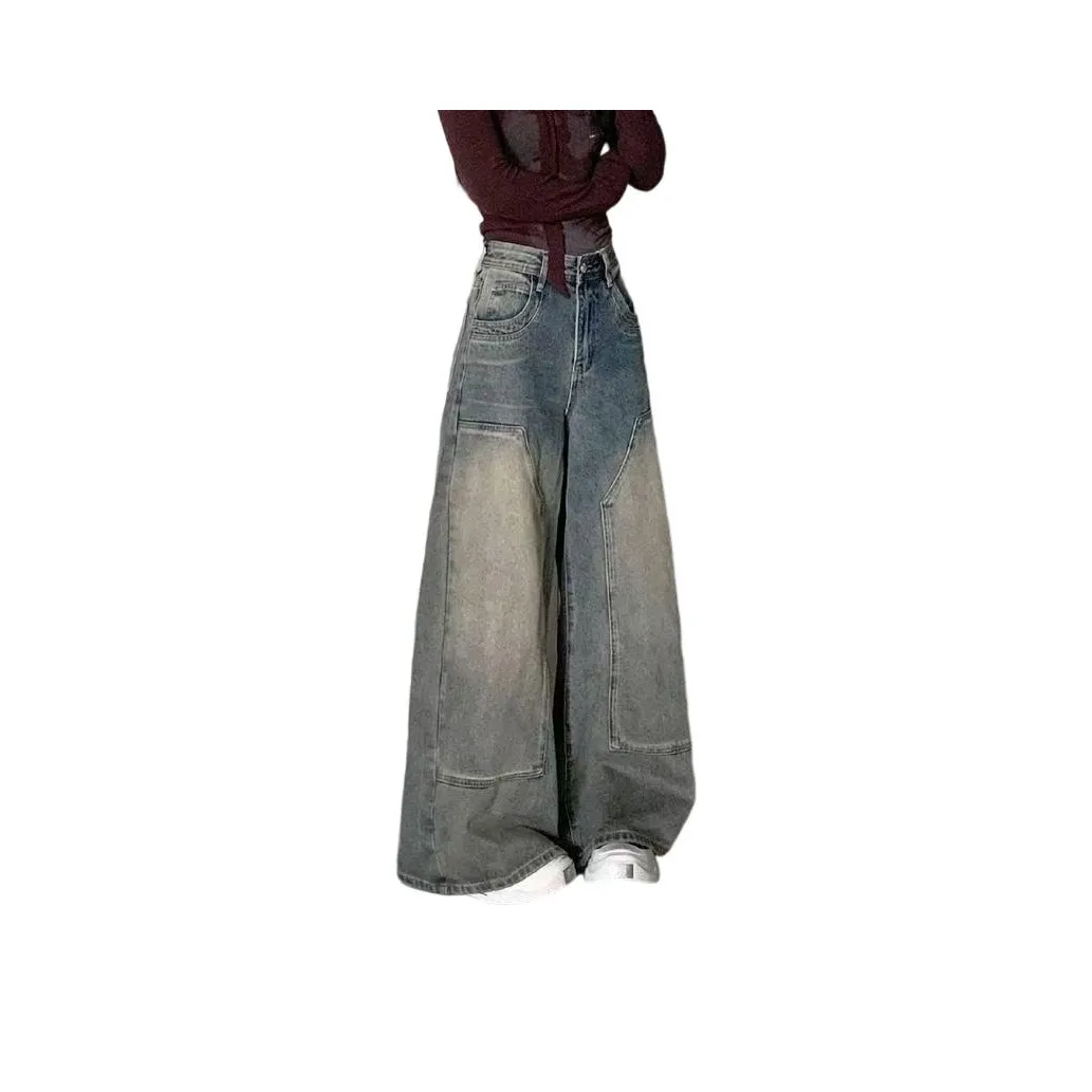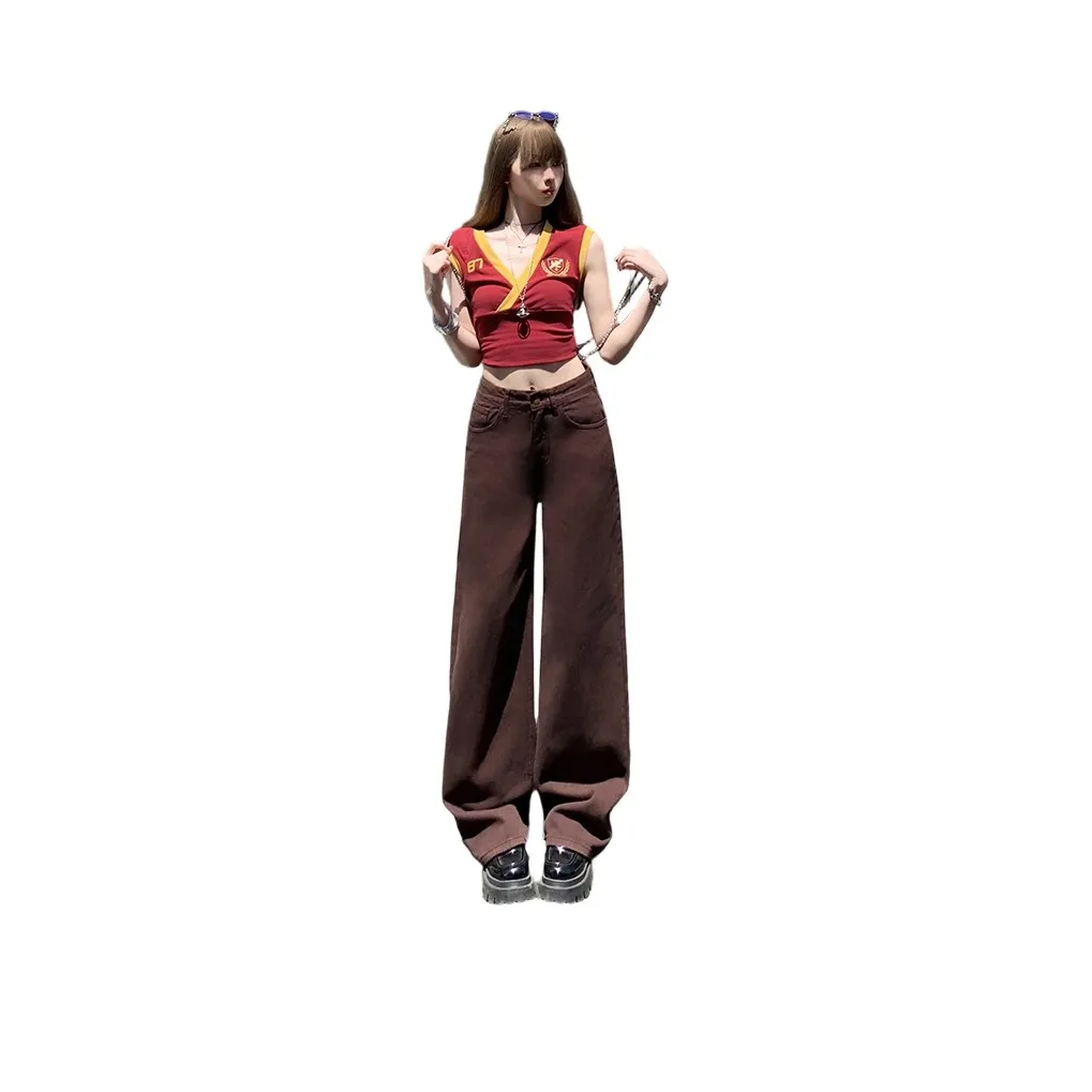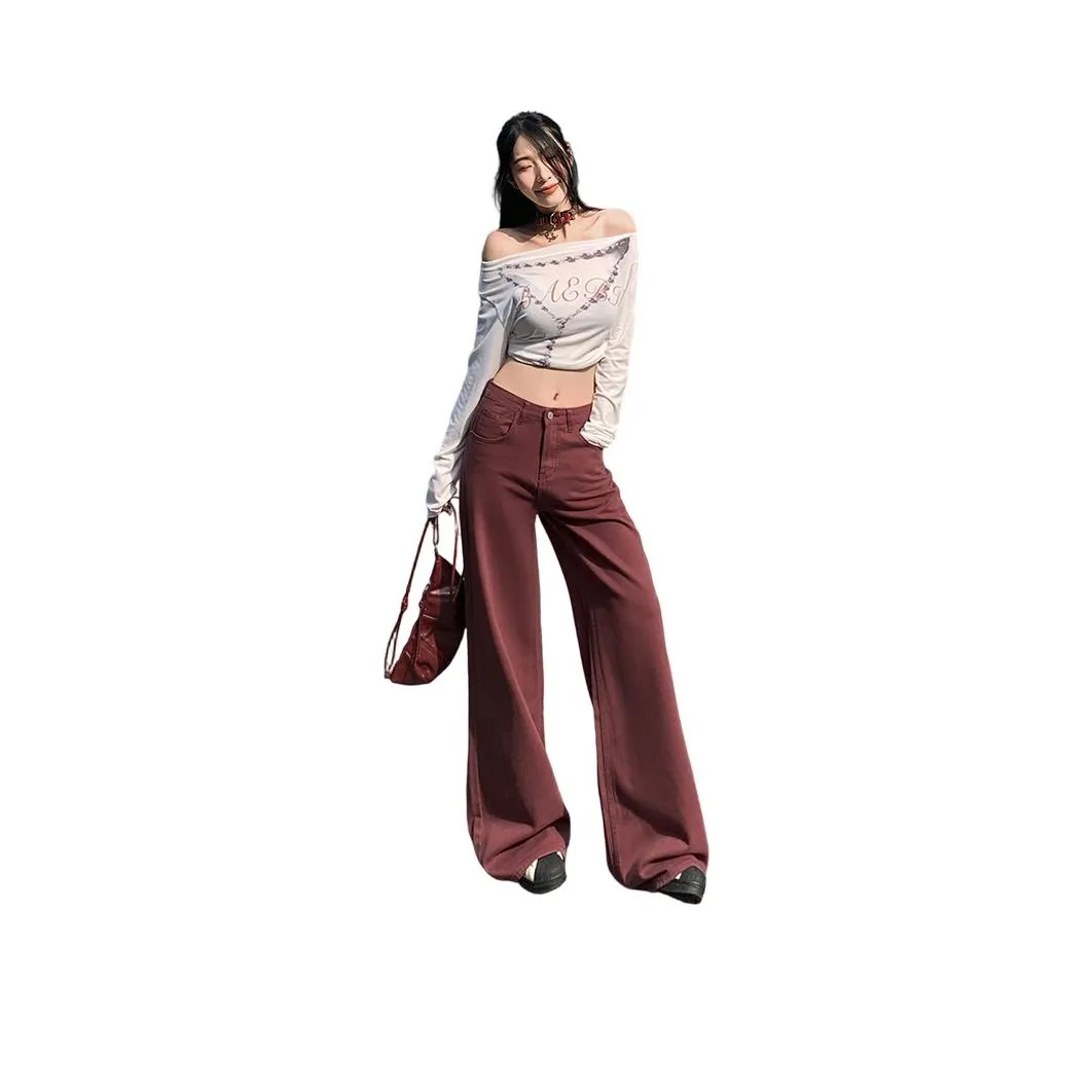 Джинсы BELOVED STARRY в темно-красном цвете с высокой талией и широкими штанинами. Изготовлены из смеси хлопка, полиэстера, эластана и вискозы, они обеспечивают комфорт и стиль. Эти брюки подходят для весны, осени и зимы благодаря умеренной толщине и отсутствию растяжимости. Закрываются на пуговицу, что добавляет удобства в носке.