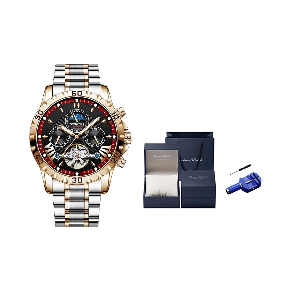 Часы POEDAGAR с автоматическим механическим движением и черным циферблатом - это идеальный выбор для тех, кто ценит качество и стиль. Корпус из нержавеющей стали и водонепроницаемость до 30 метров делают их практичными для повседневного использования.