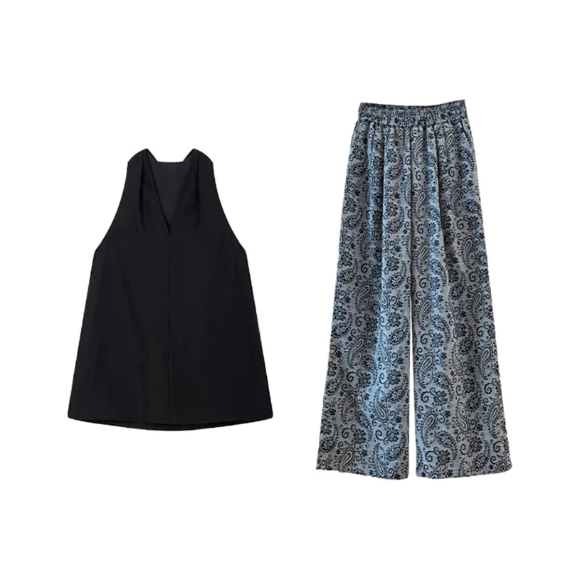 Костюм от SNBL состоит из брюк и топа, выполненных из смеси хлопка и полиэстера. Этот комплект с цветочным принтом подходит для весны и лета благодаря своей умеренной толщине и высокому поясу.