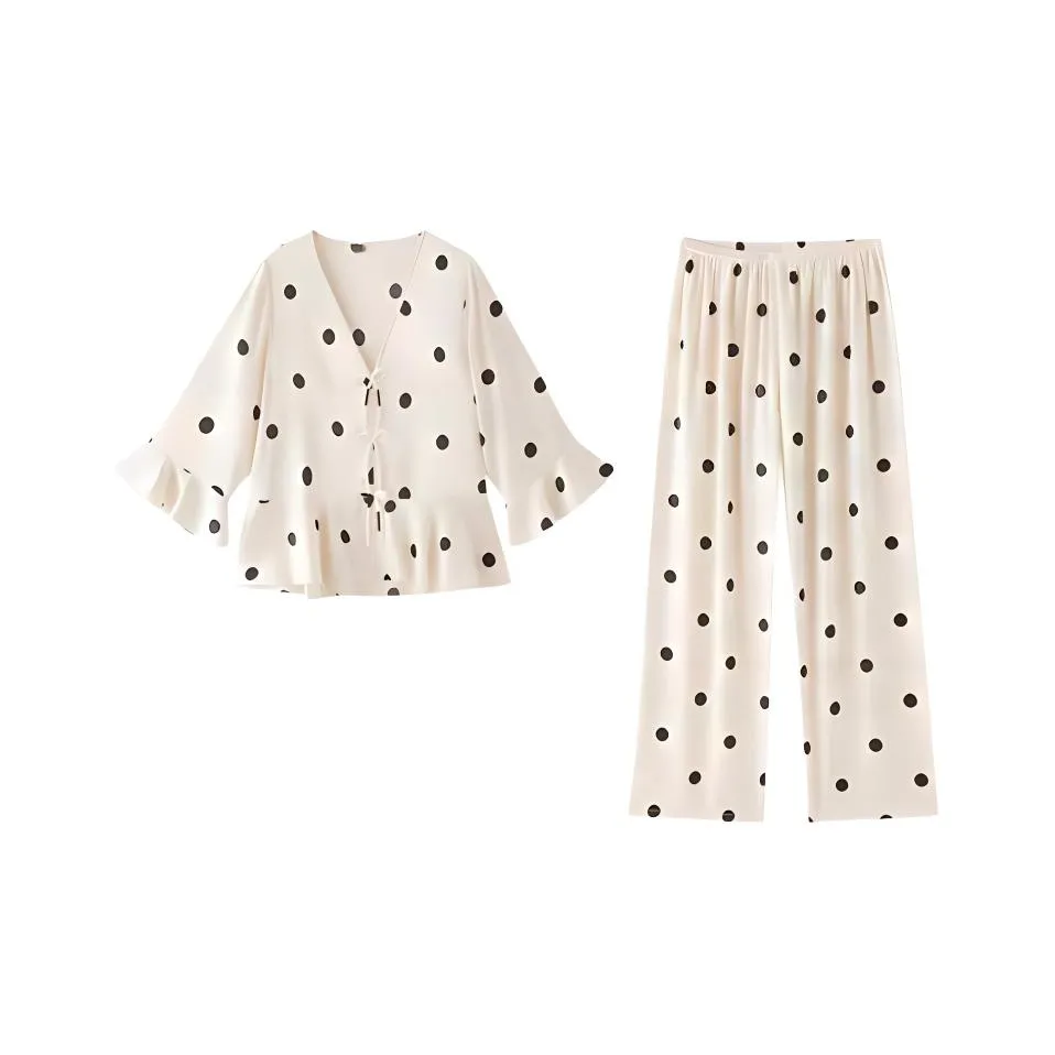 Пижамный комплект MIIOW с горошками - это идеальный выбор для осени. Он изготовлен из смеси полиэстера и эластана, что обеспечивает отличную воздухопроницаемость и охлаждение. С дроп-рукавами и средней посадкой на талии, этот комплект подходит для комфортного сна.