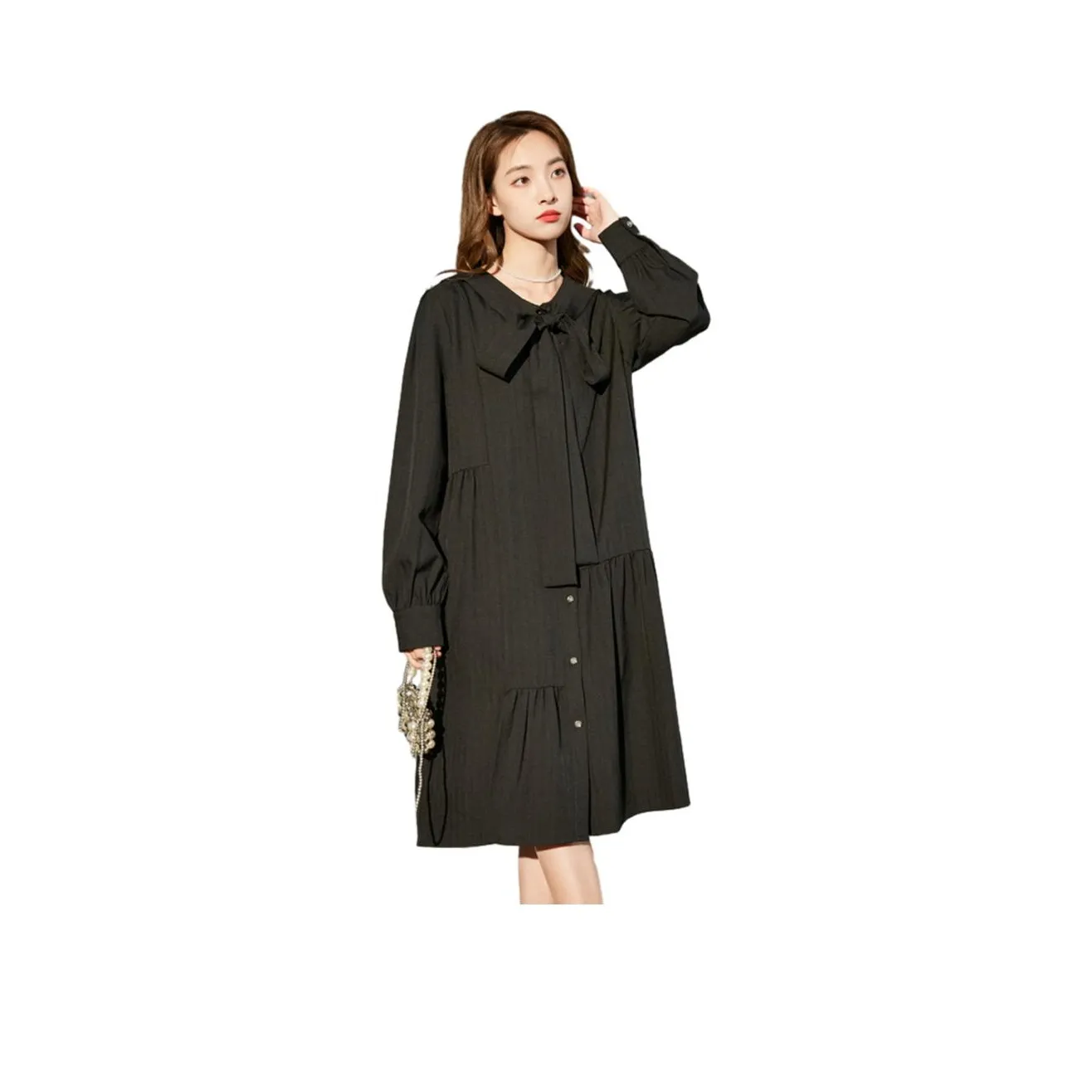 XUOIZA Длинное платье с длинными рукавами женское черное + резинка для волос с бантом в комплекте с подарками