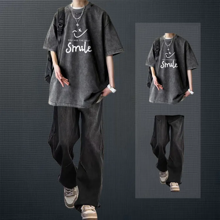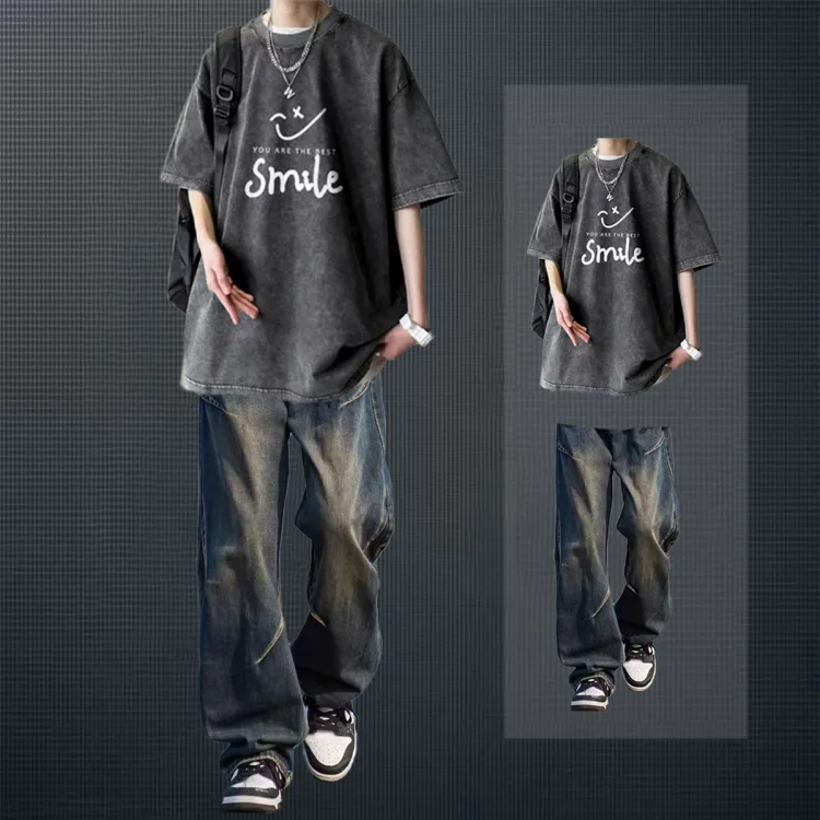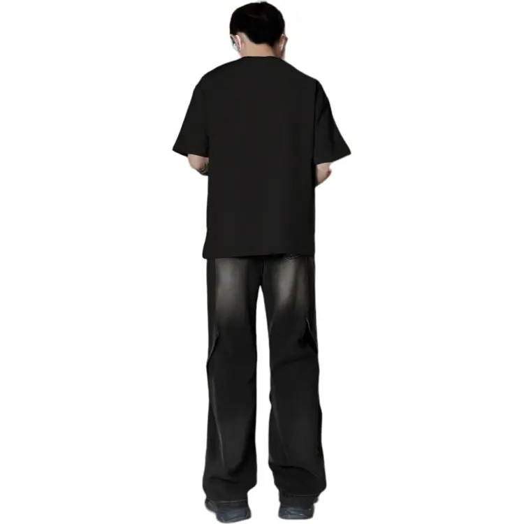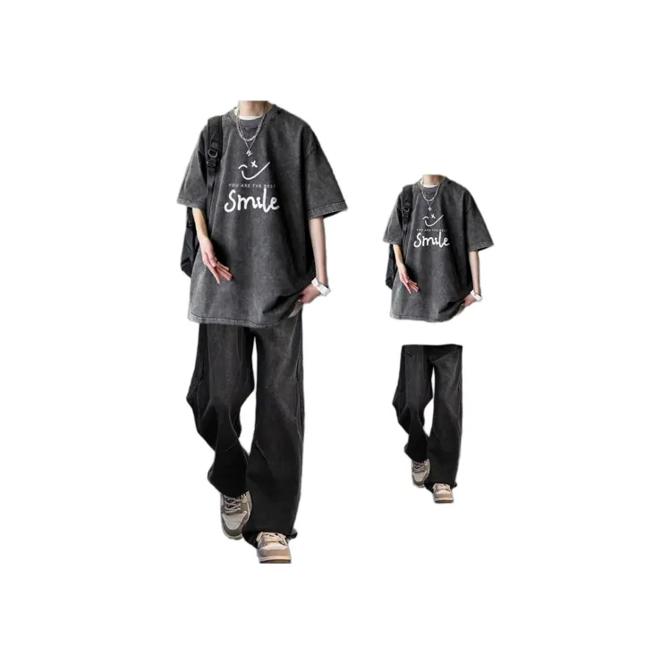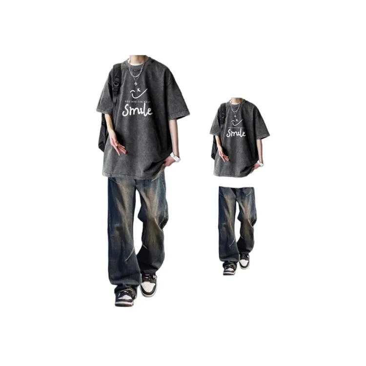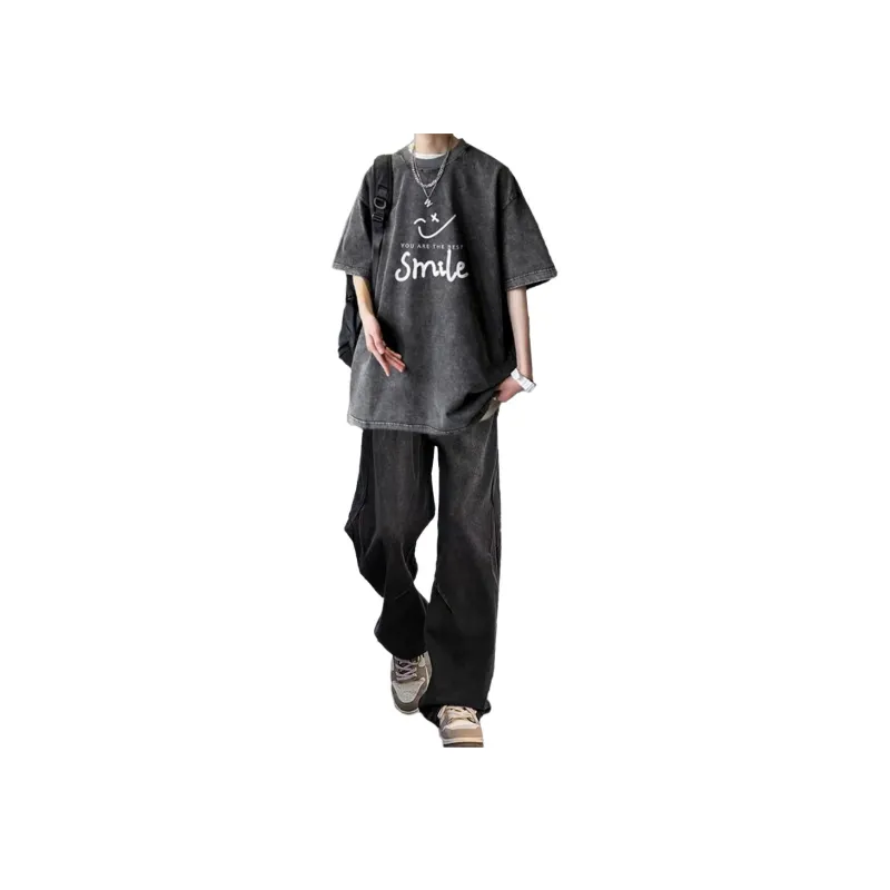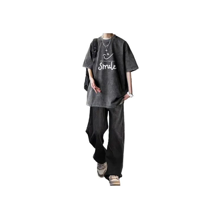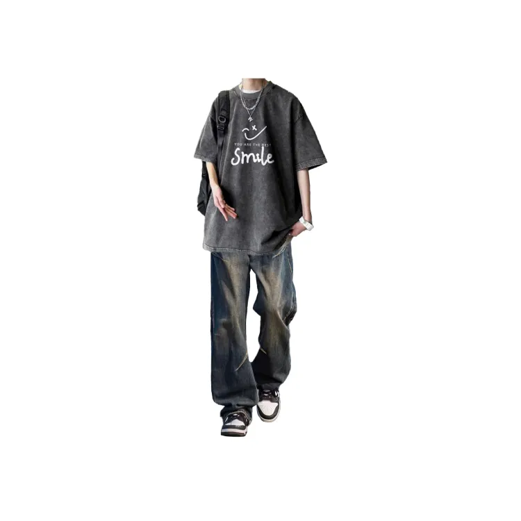 Черная и серая футболка + черные джинсовые штаны [булавка, логотип, стиль позиционирования]