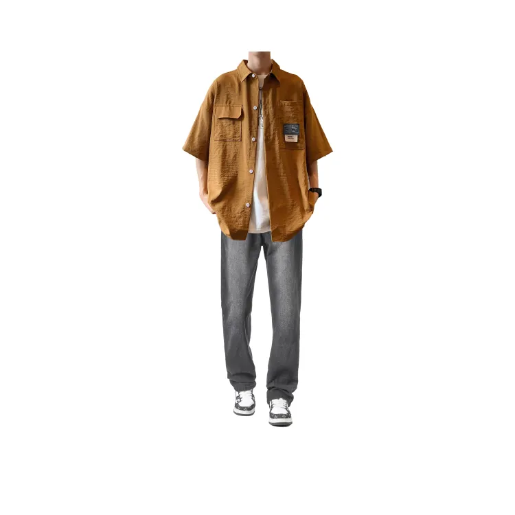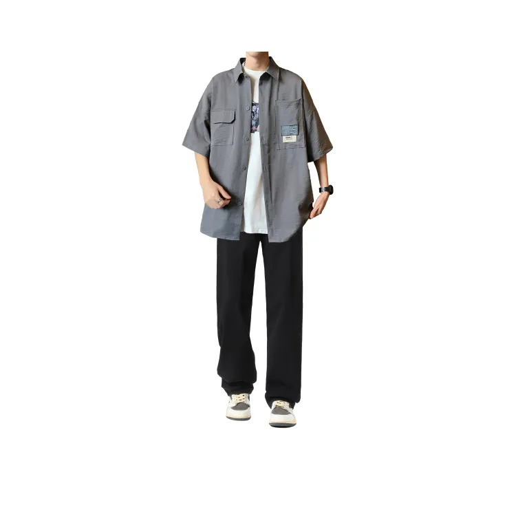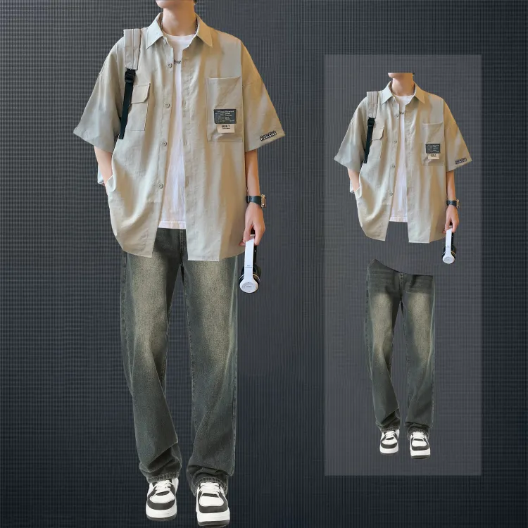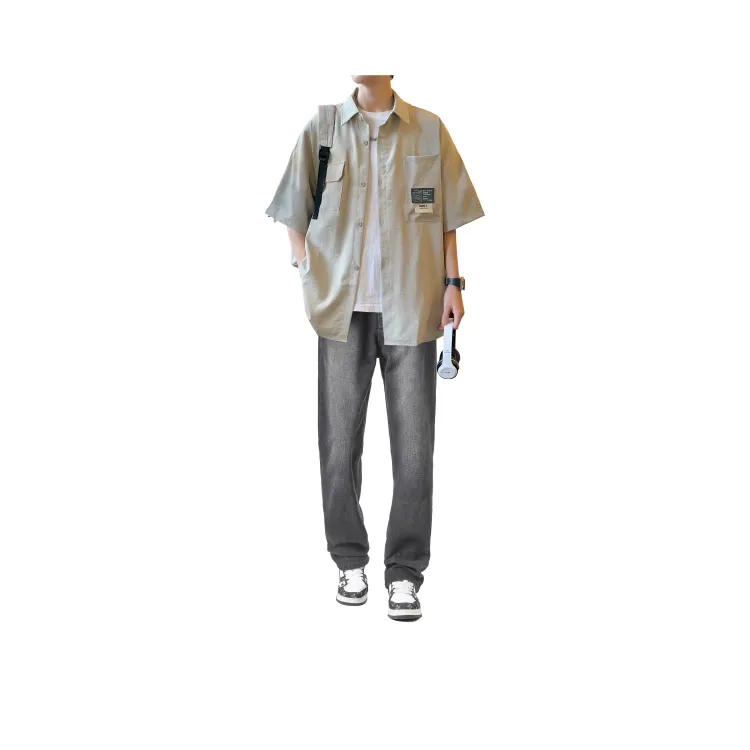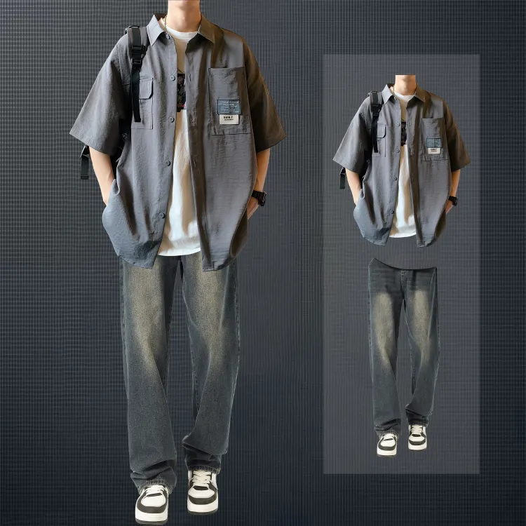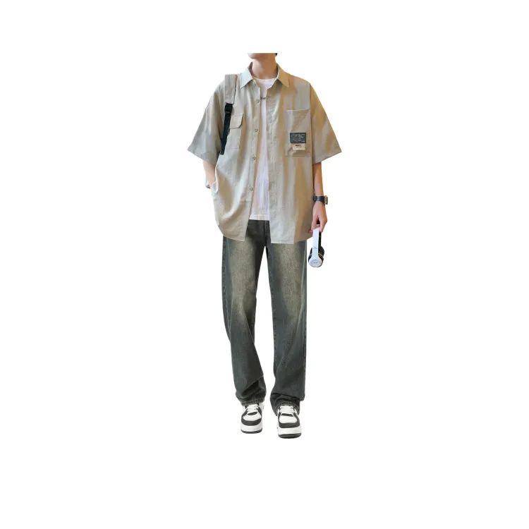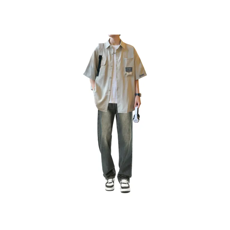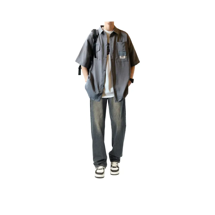 Светло-серая рубашка + винтажные синие джинсы [булавка, логотип, стиль позиционирования]
