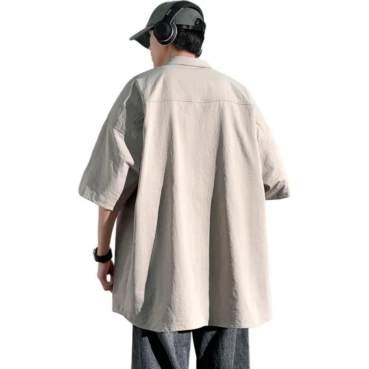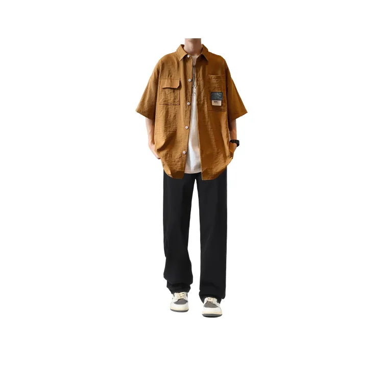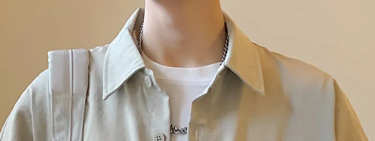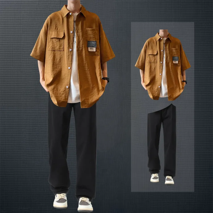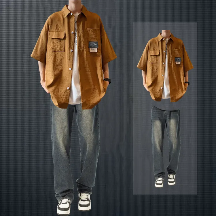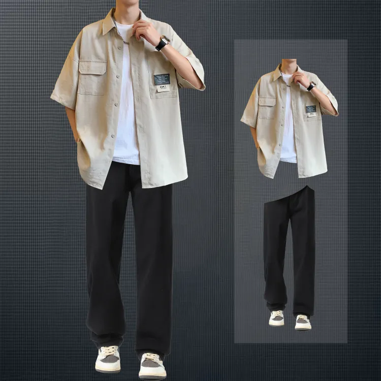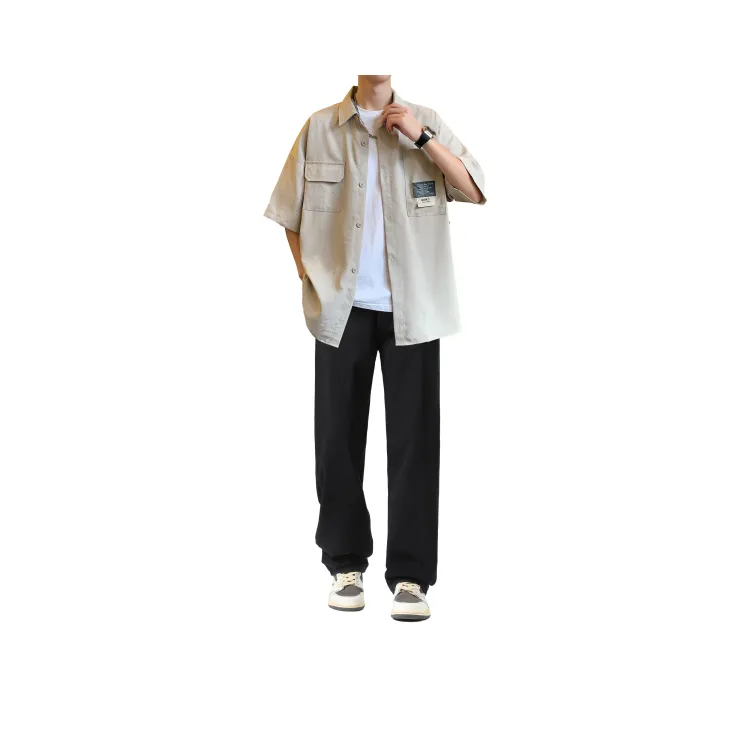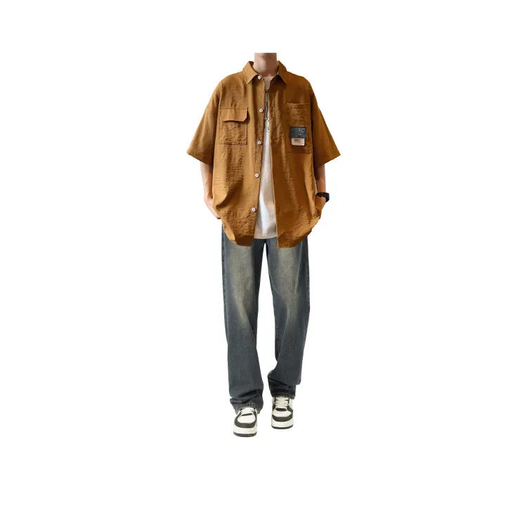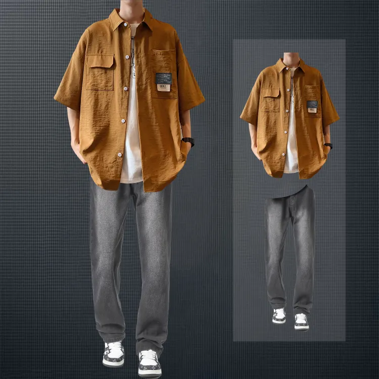 Светло-серая рубашка + винтажные синие джинсы [булавка, логотип, стиль позиционирования]