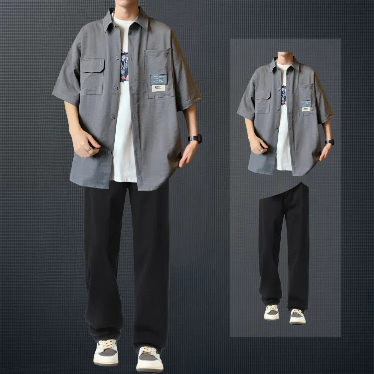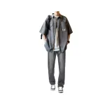 Дымчатый серый рубашка + черные джинсовые штаны