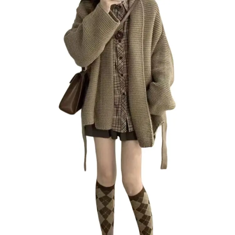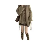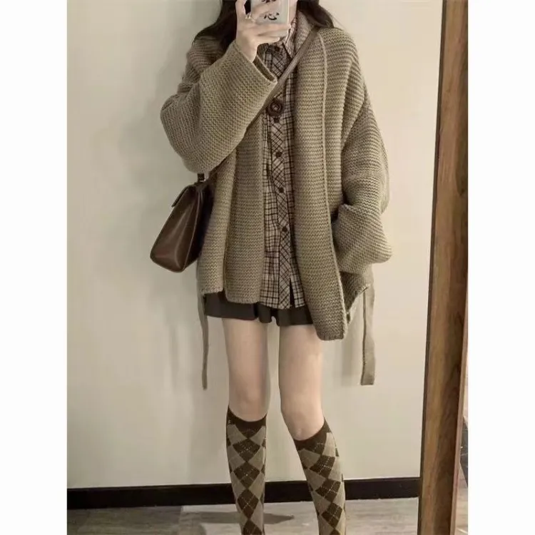 Комплект:[Трехкомпонентный комплект] Хаки Свитер + Клетчатая Рубашка + Юбка с оборками