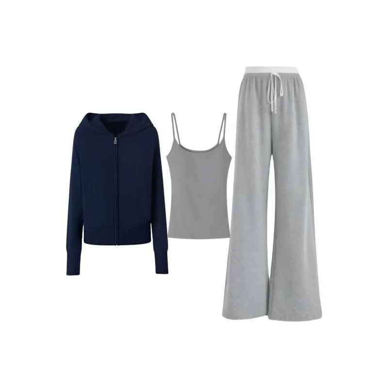 Комплект:Темно-синий синий пальто + серый топ на бретелях + серые штаны