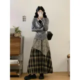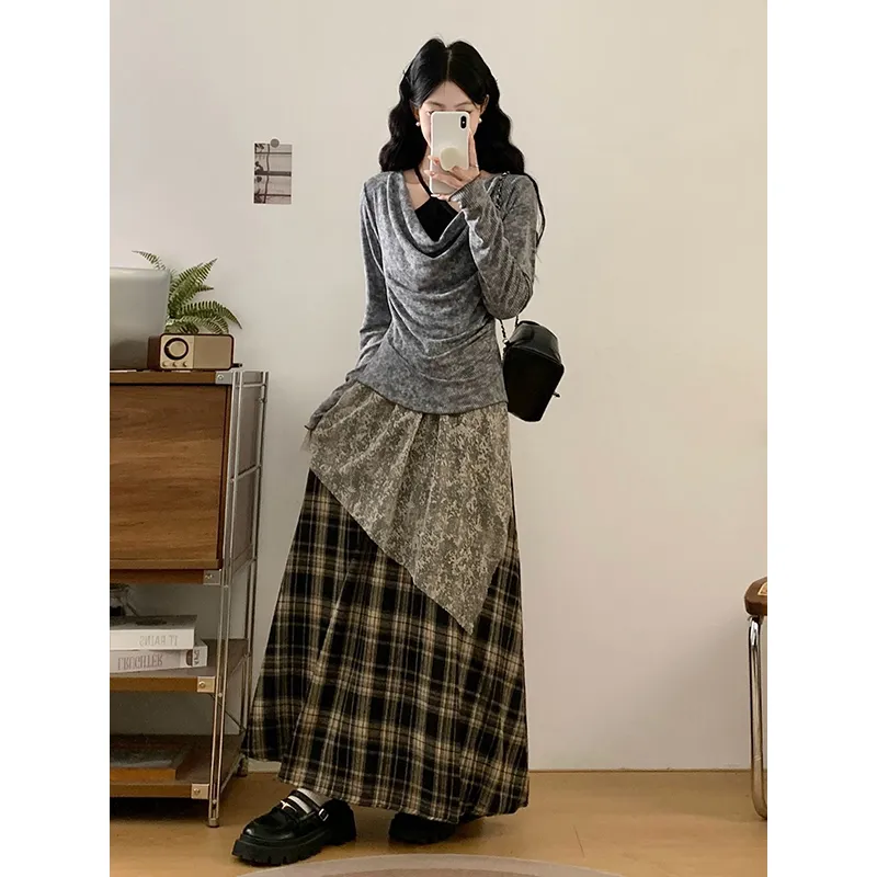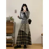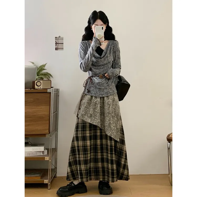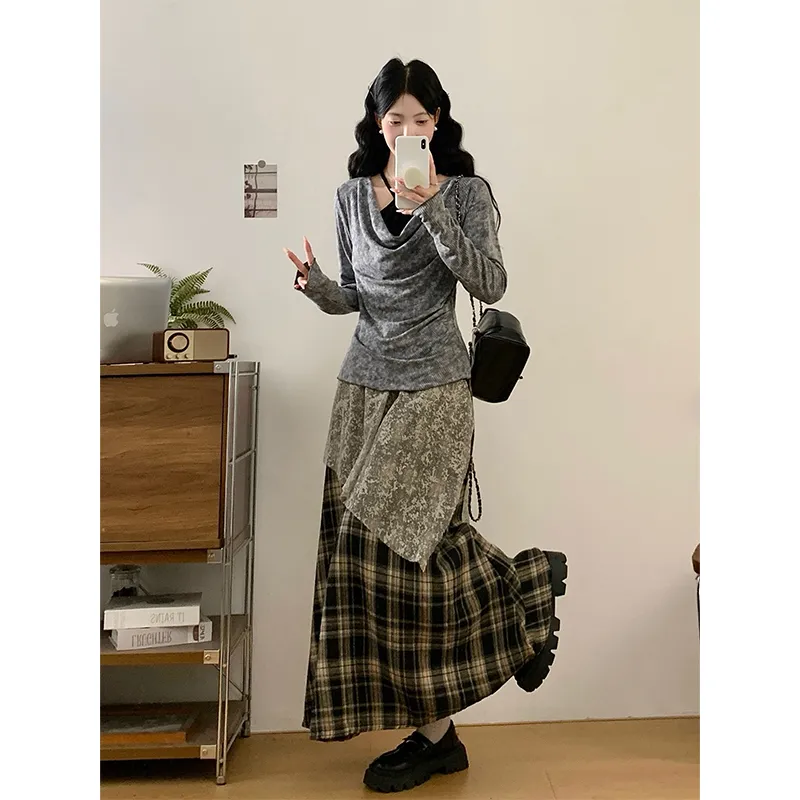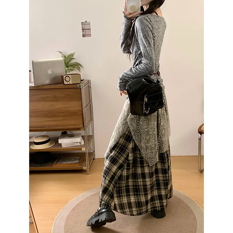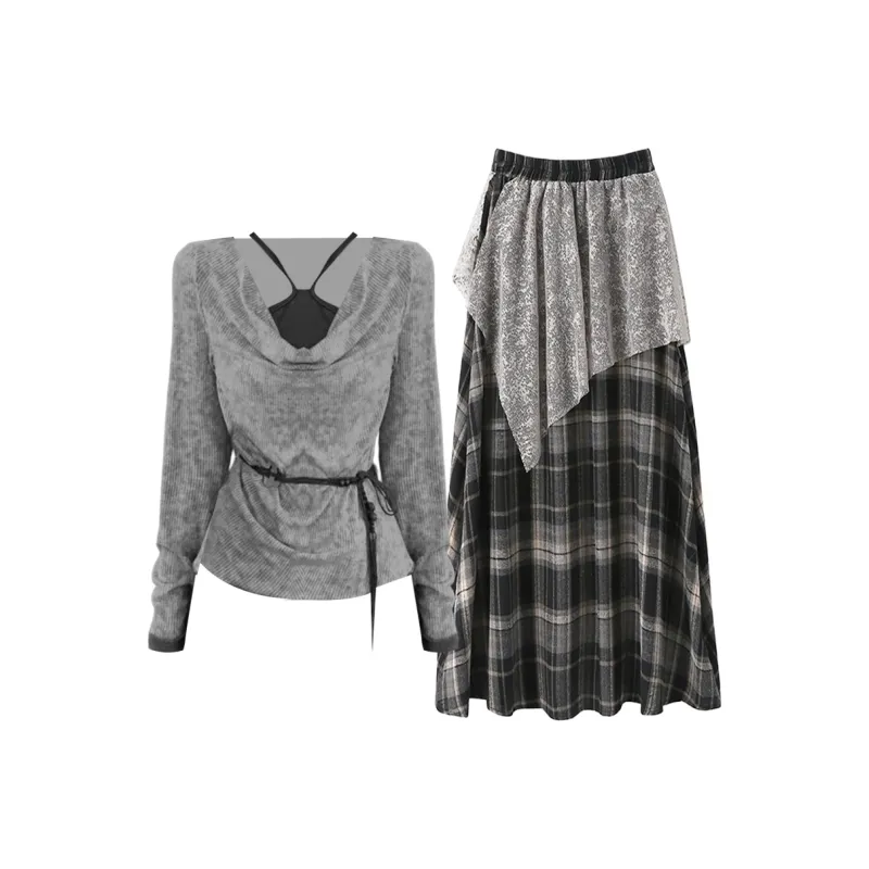 Комплект:Серый топ + черная юбка в клетку