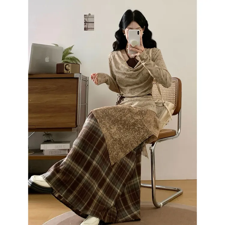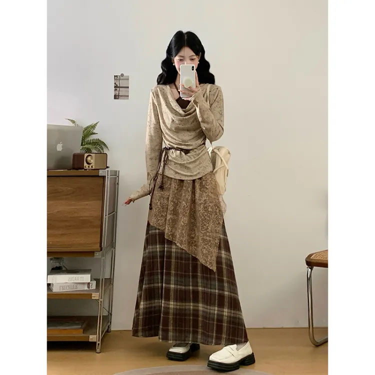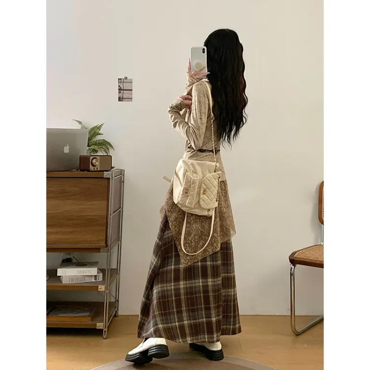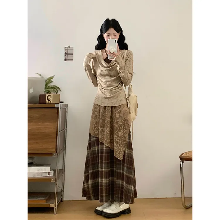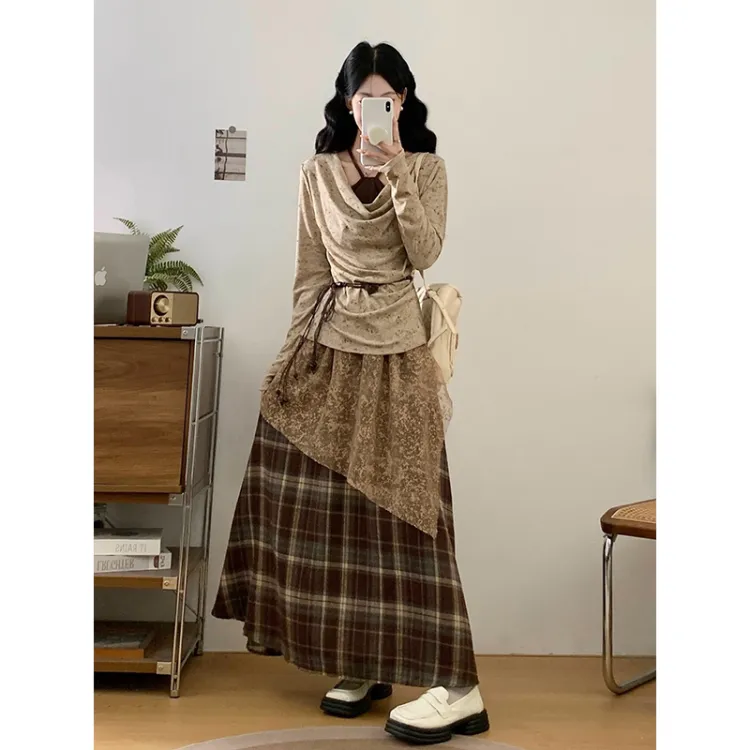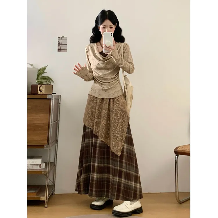 Светлый хаки топ + кофейная юбка в клетку