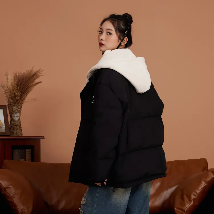 Комплект (Черный пуховик + Светло-синие джинсовые штаны)