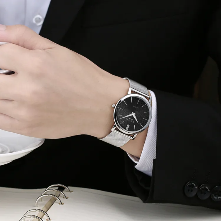 Серебряный корпус с черным циферблатом - серебряная сетка, полоска