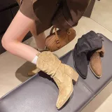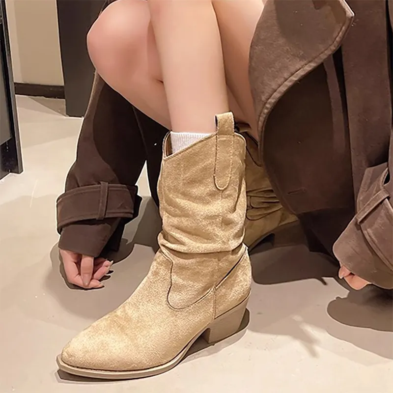 Али Тх Фокс Замша Винтаж Элегантный Плиссированный Stacked Ботинки Ботильоны Женские