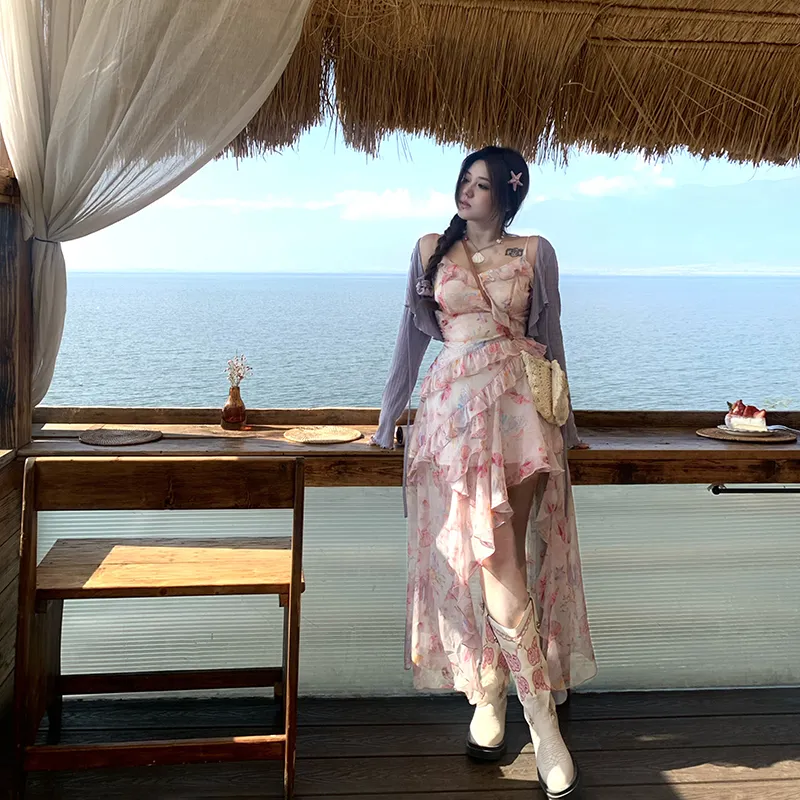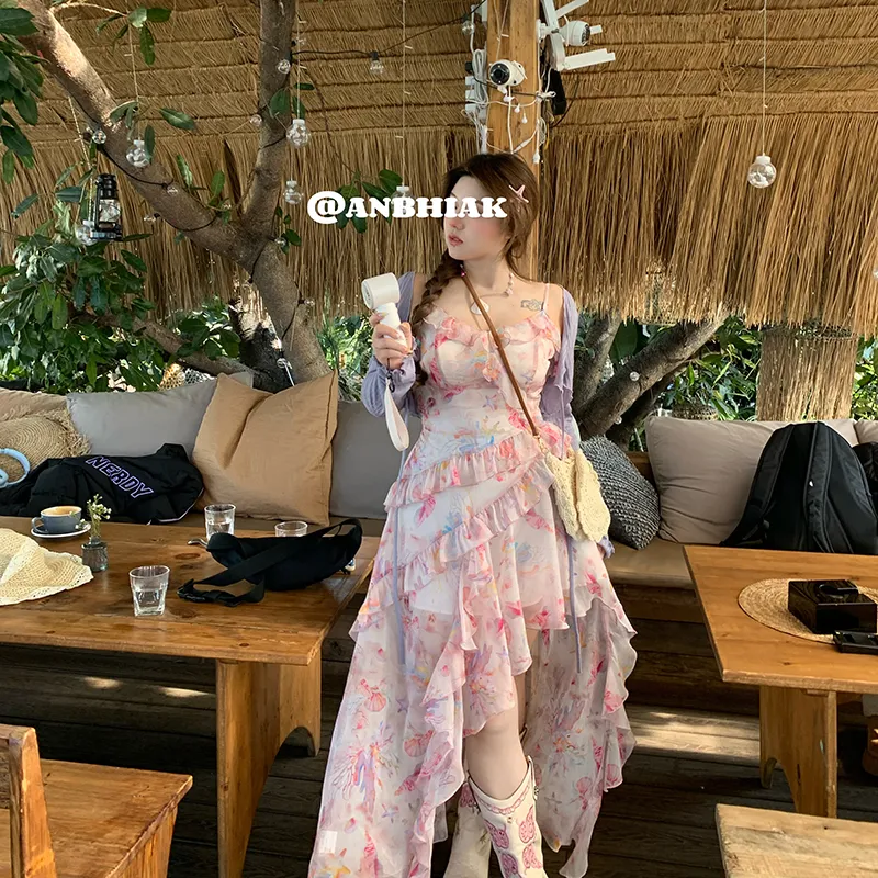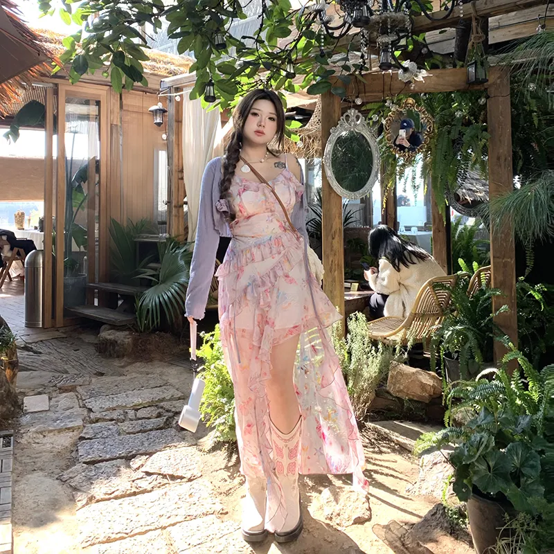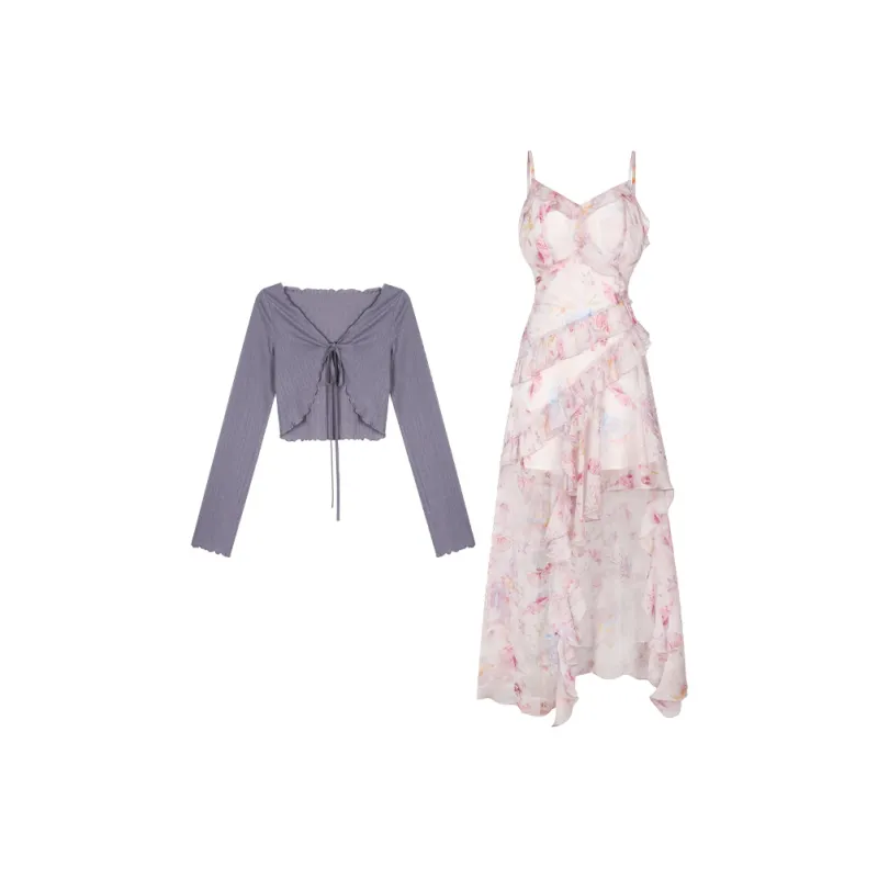 Annie The Темный Child Комплект с юбкой Женские Фиолетовый Кардиган+Цветочный Slip Платье
