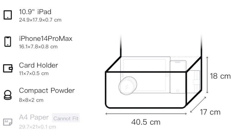 Длина 40,5 см * Ширина 17 см * Высота 18 см
