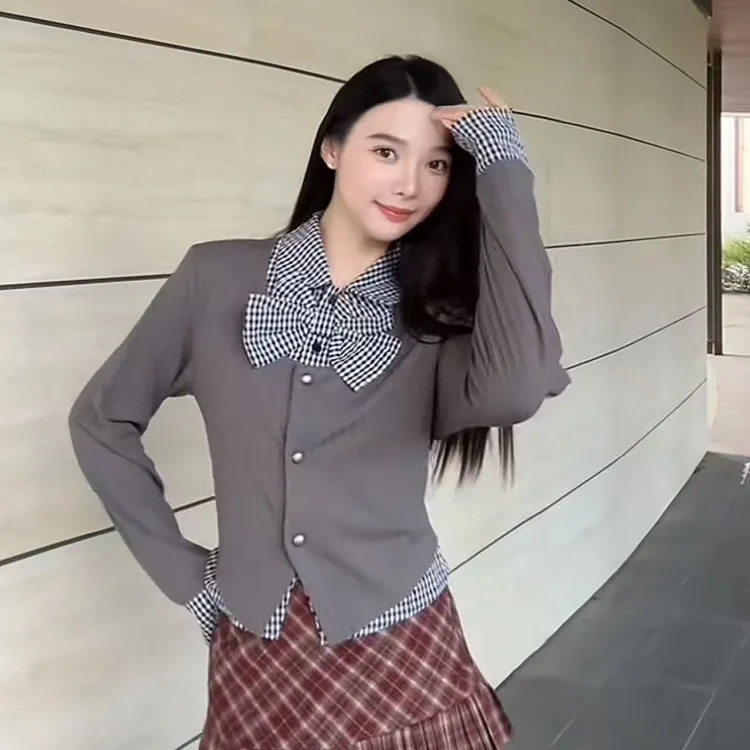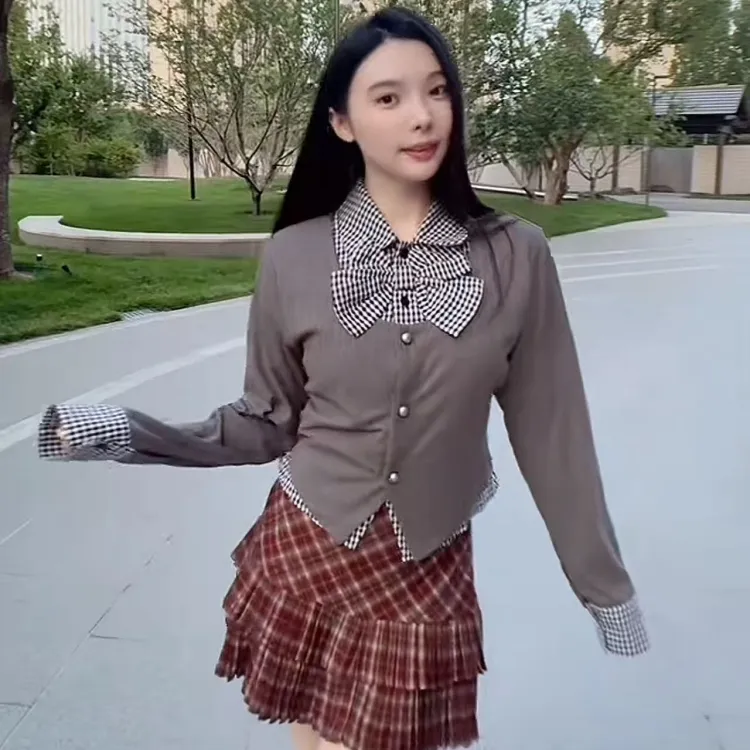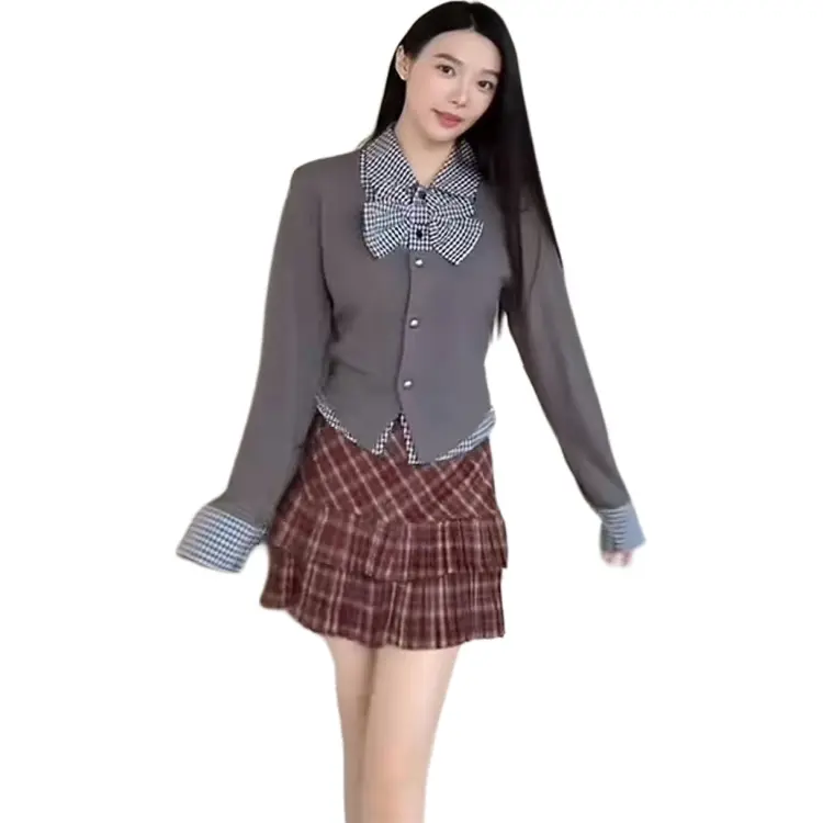 Комплект:Серый комплект (топ + красная клетка, короткая юбка)