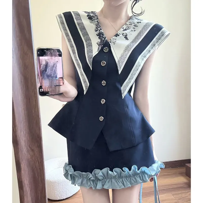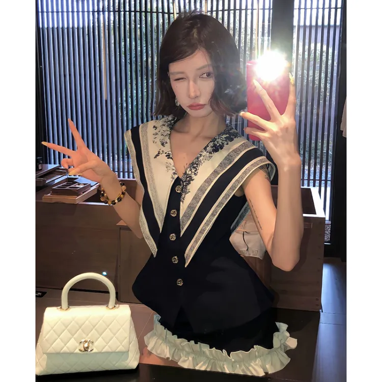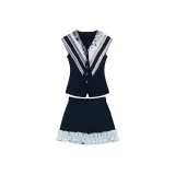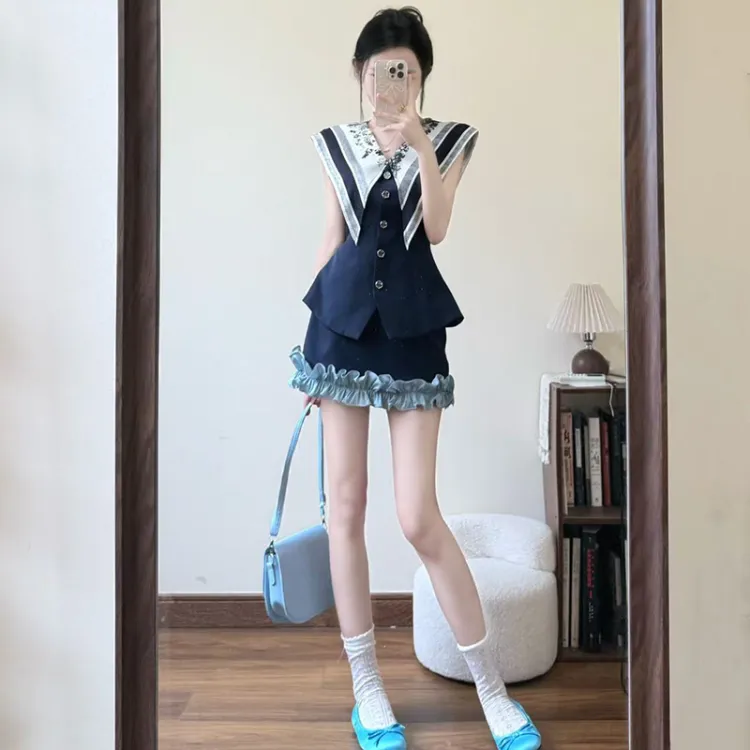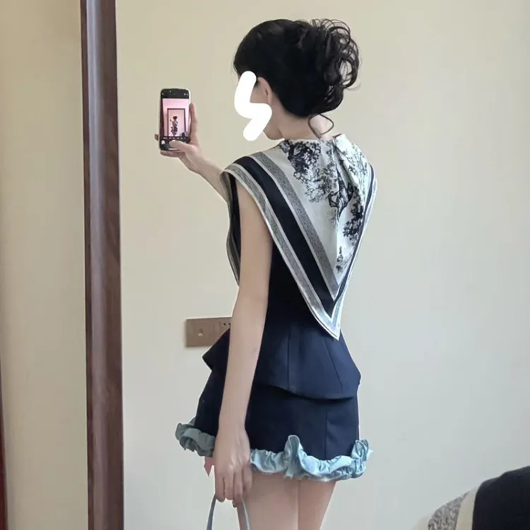 Комплект:Темно-синий синий топ без рукавов + темно-синяя короткая юбка, комплект одежды