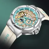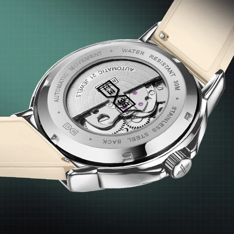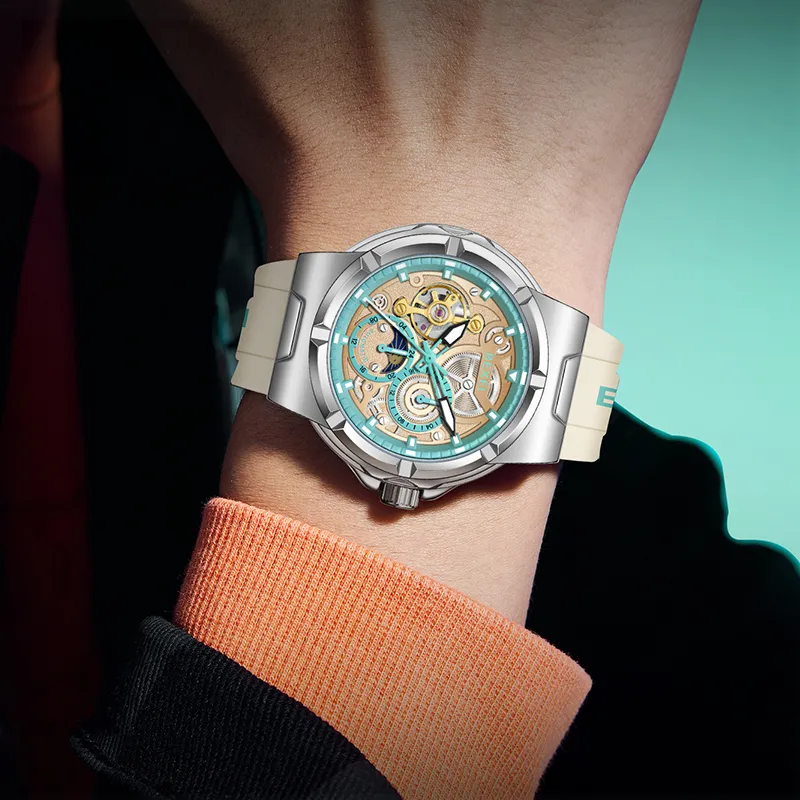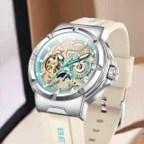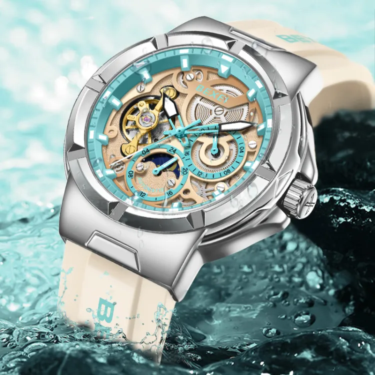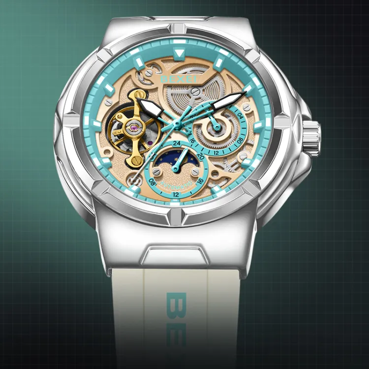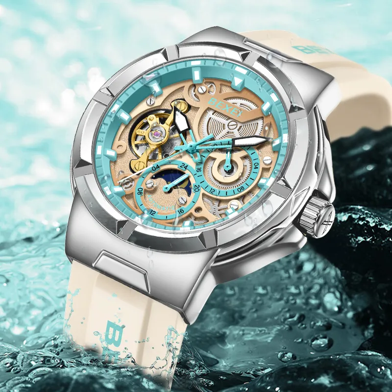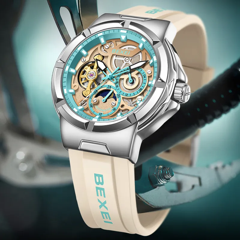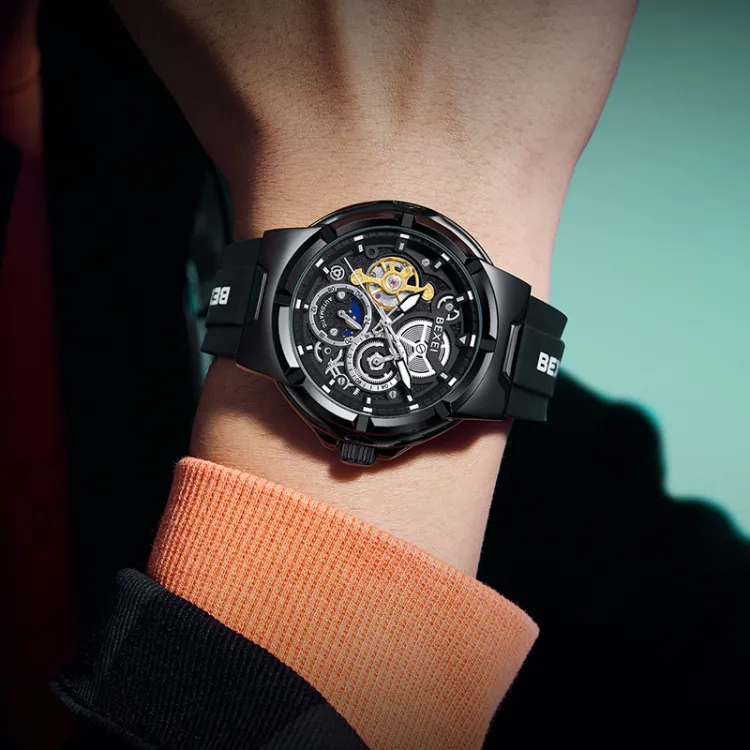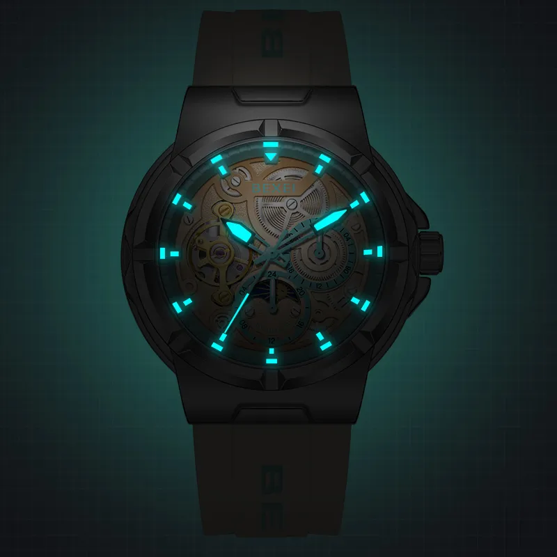 BEXEI Черный Warrior Механический Механизм Резиновый Ремешок Часы Мужские Часы С Чертежом Skeleton