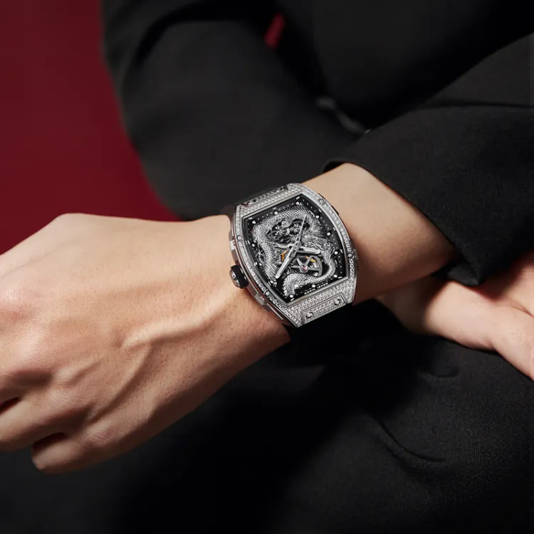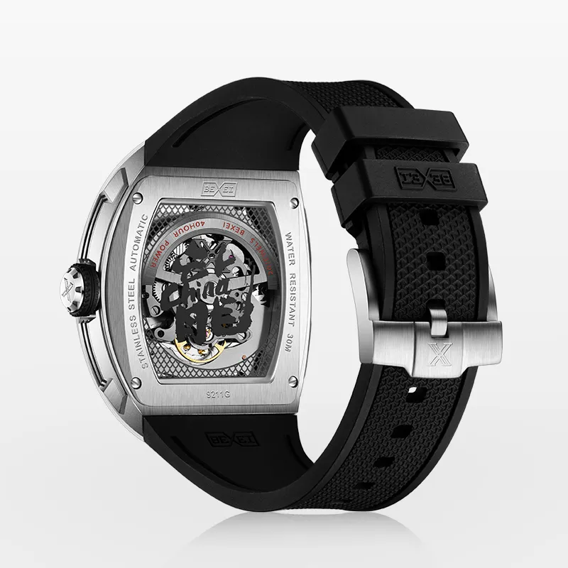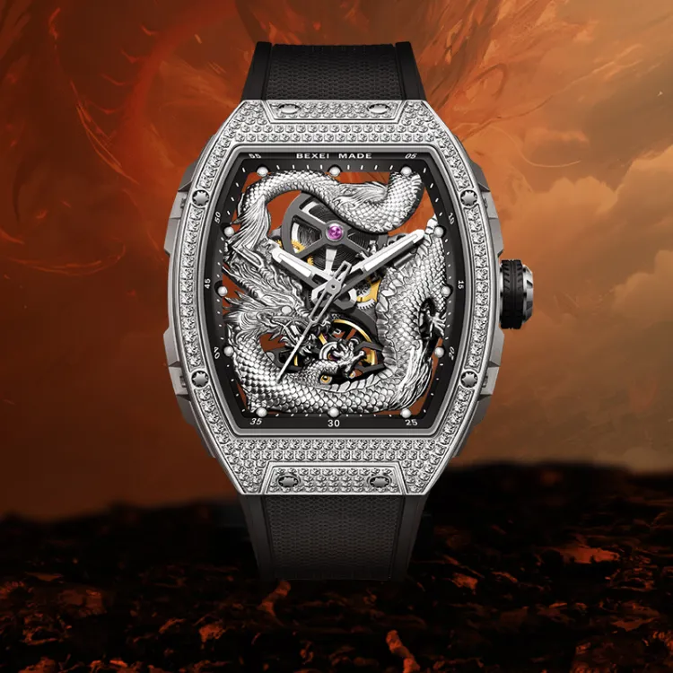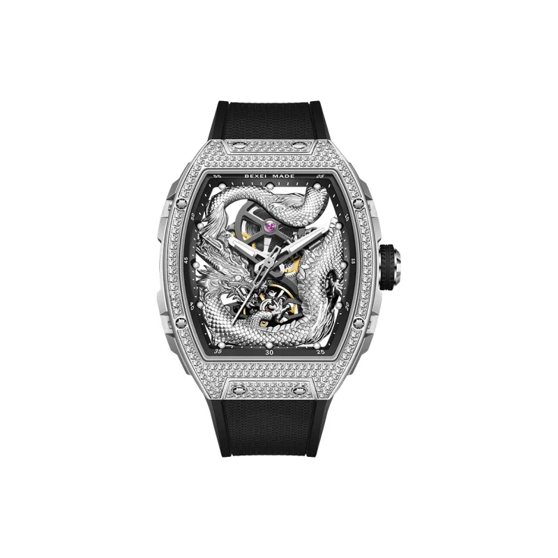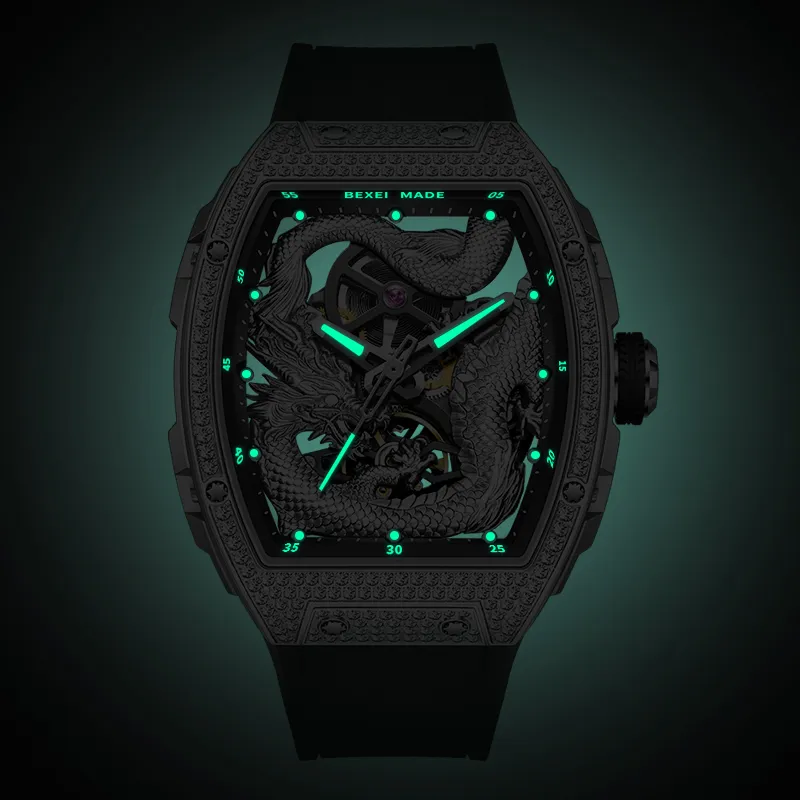 BEXEI Год Дракона Ограниченная серия Автоматический Механический Механизм Резиновый Ремешок Часы Мужские Часы Скелетный Циферблат