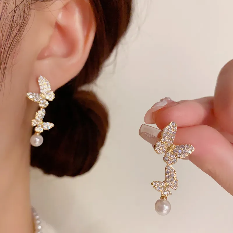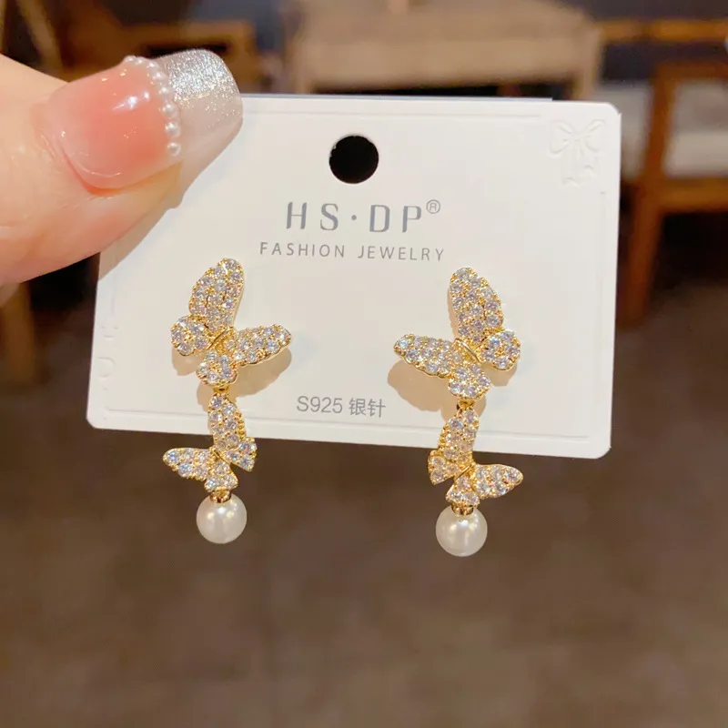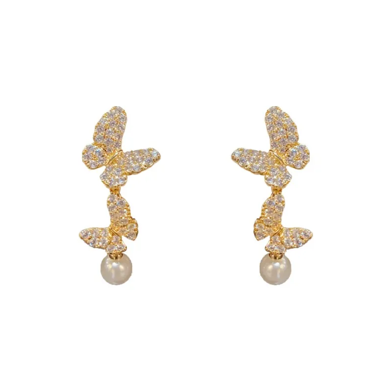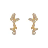 Стиль:Золото-цирконовая бабочка, жемчужная бахрома, серьги-подвески (утолщенное настоящее золото, гальваническое покрытие)