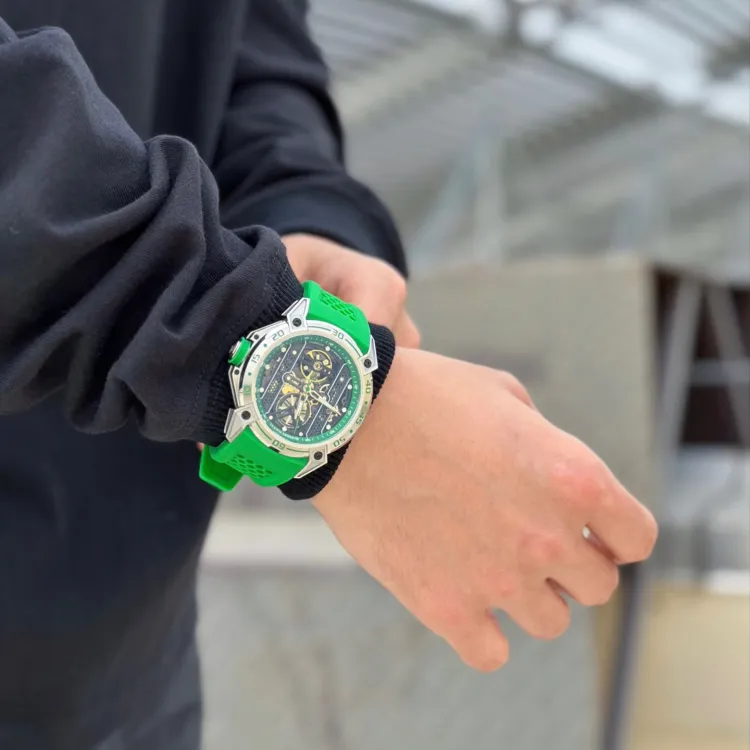 Серебряный корпус, зеленое лицо, зеленые ленты, модель автомобиля, коробка (случайная модель автомобиля)