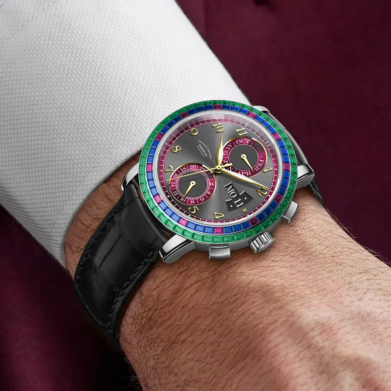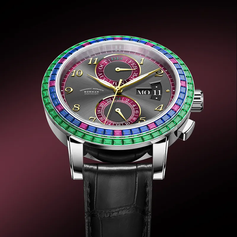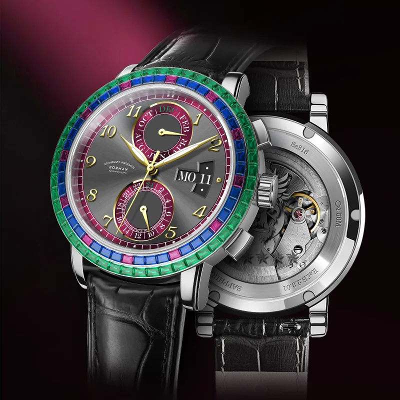 BORMAN Автоматический Механический Механизм Коровья Кожа Ремешок Часы Мужские Черный Циферблат