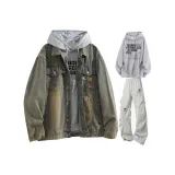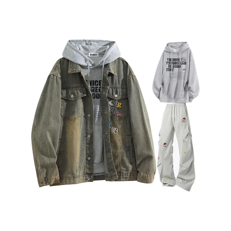 Деним Куртка - Синий, Желтый Грязь: 43,9% хлопок, 41,5% регенерированное целлюлозное волокно, 14,6% деним Куртка - Темно-Серый: 48,3% хлопок, 33,5% полиэстер, 18,2% Свитшот: 100% полиэстер Штаны: 100% полиэстер