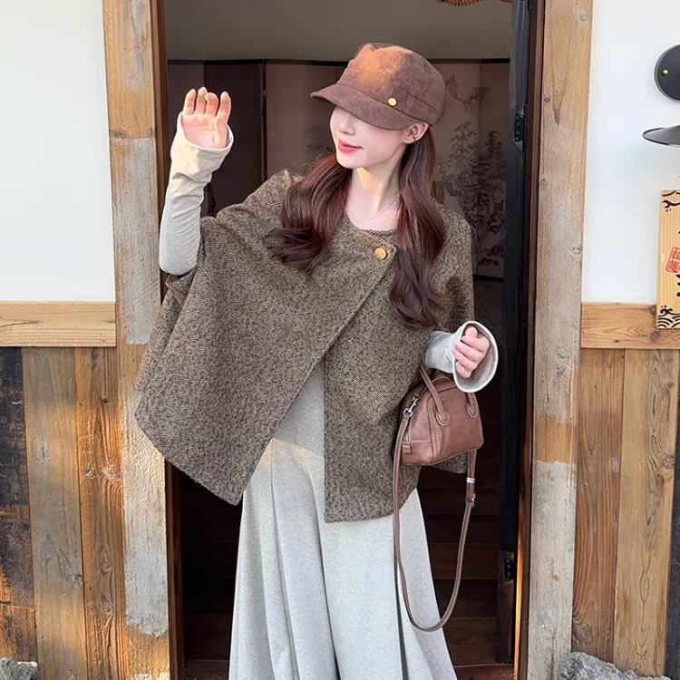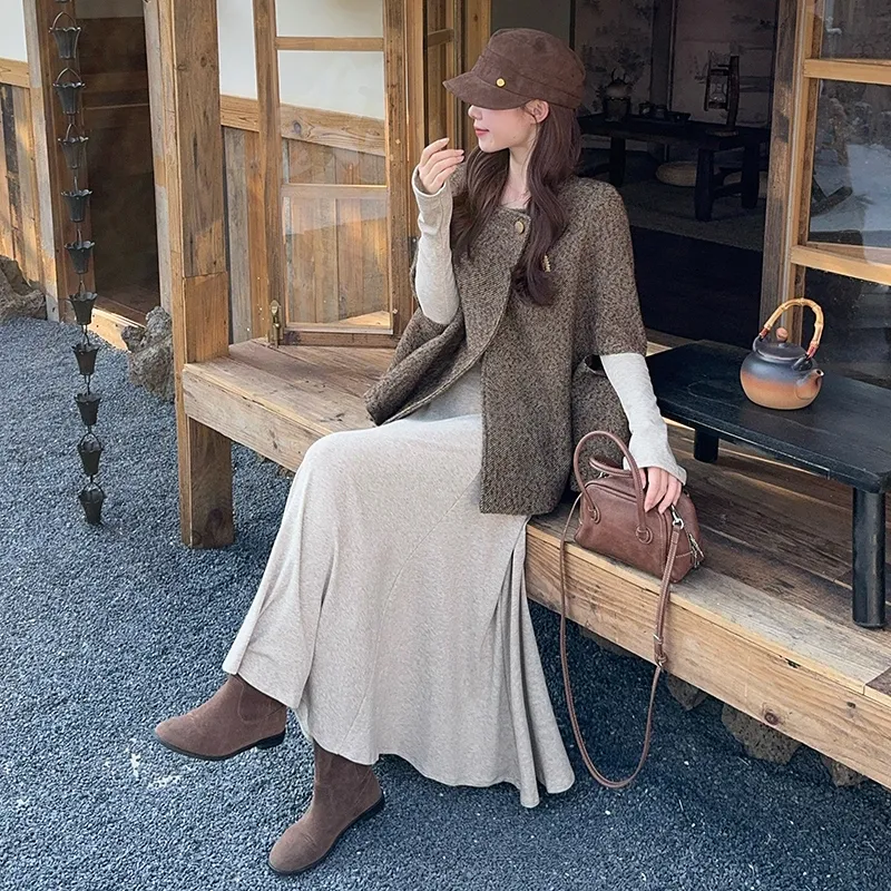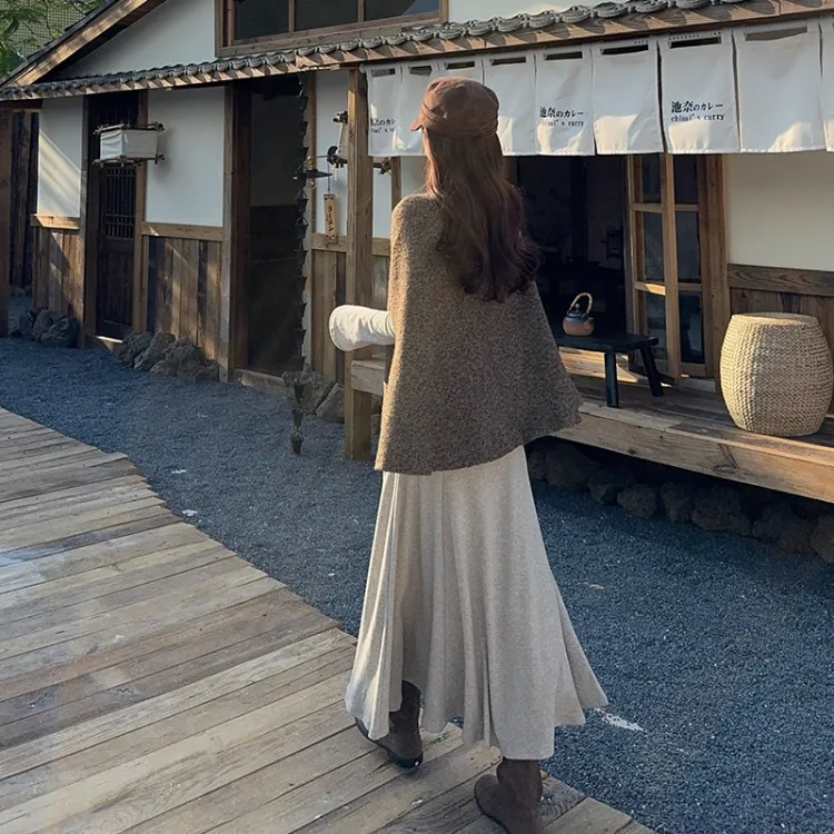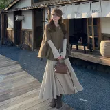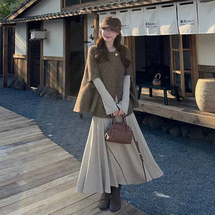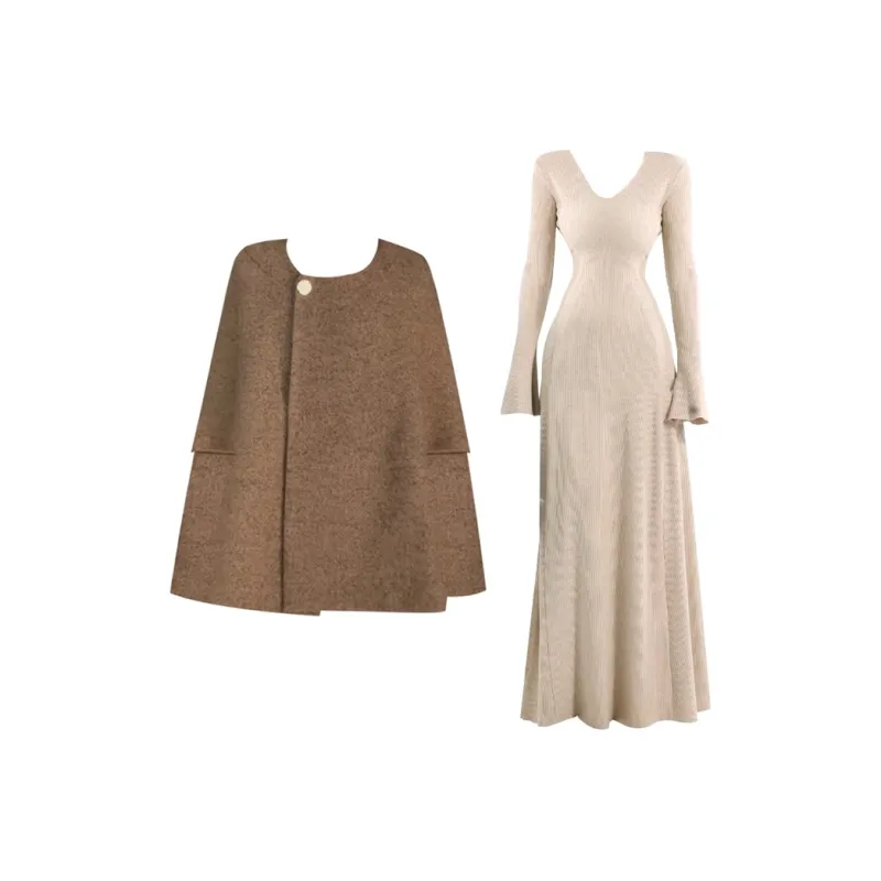 Комплект:Кофейный плащ + овсяная юбка