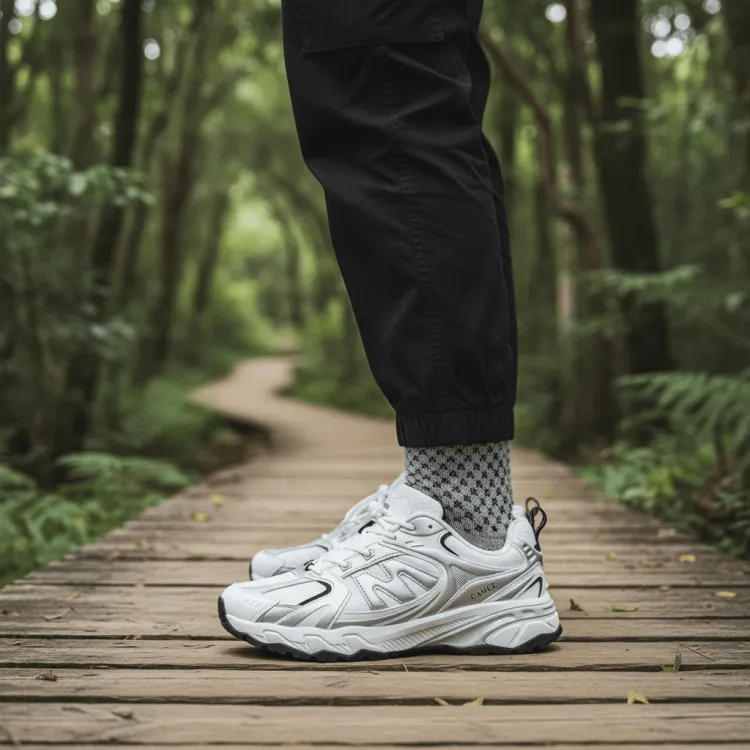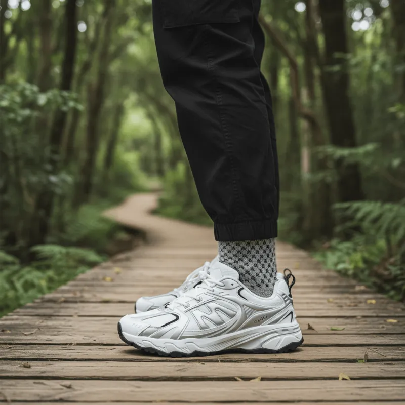 Обувь изготовлена из нескользящего и износостойкого материала, обеспечивая надежное сцепление как на неровных горных тропах, так и на скользких поверхностях, что предотвращает падения и повышает безопасность. Минималистичный дизайн с классической черно-белой цветовой гаммой, дополненный стильными линиями и деталями, делает эту модель подходящей как для активного отдыха, так и для повседневного использования, подчеркивая индивидуальность и вкус.