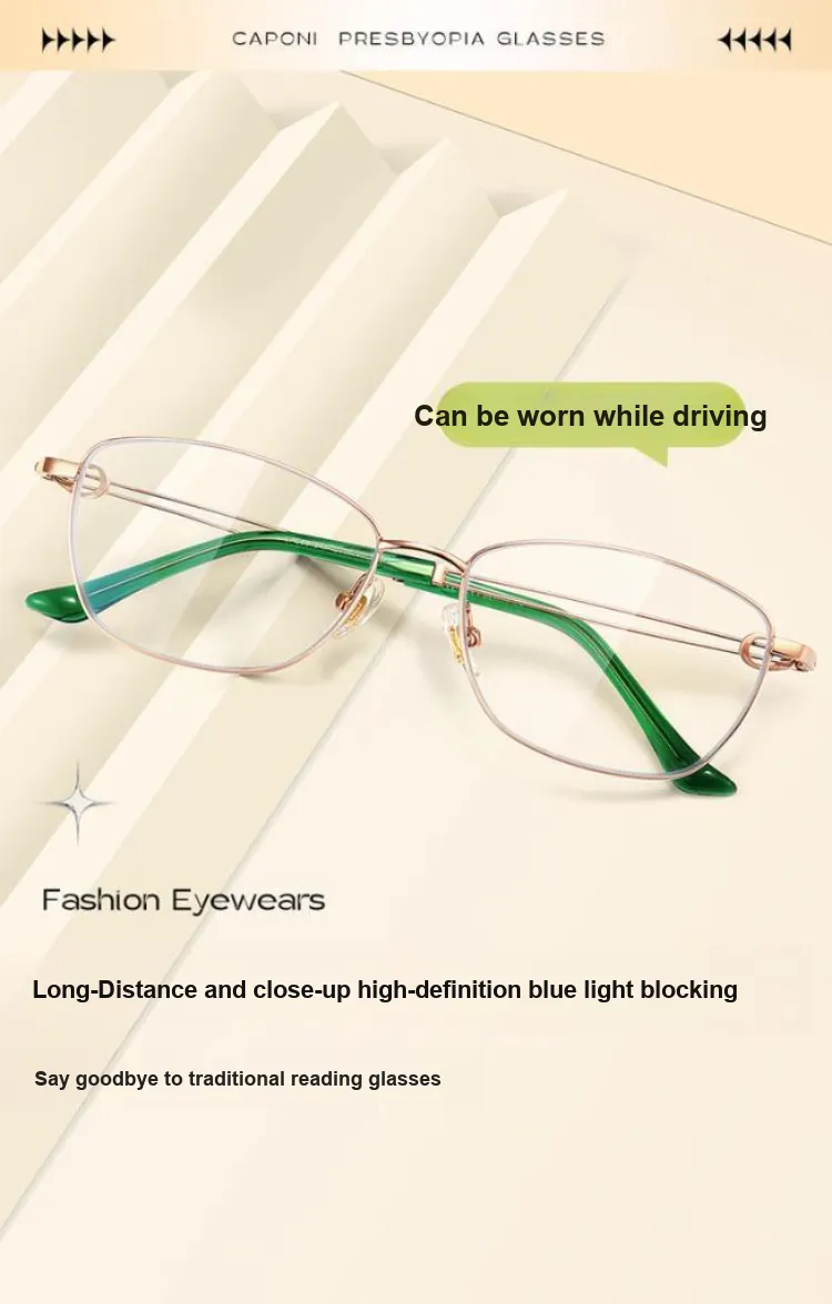 Золотая рамка, зеленые ноги, 200 градусов, универсальный для близкого, среднего и дальнего зрения — рекомендуется для возраста 55-59 лет