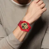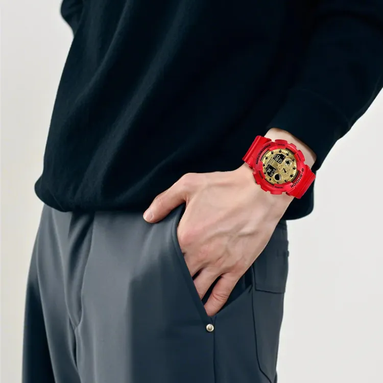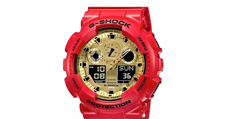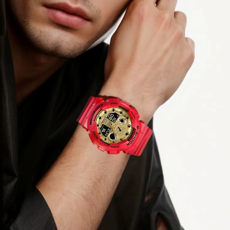 Золотой циферблат, красный ремешок