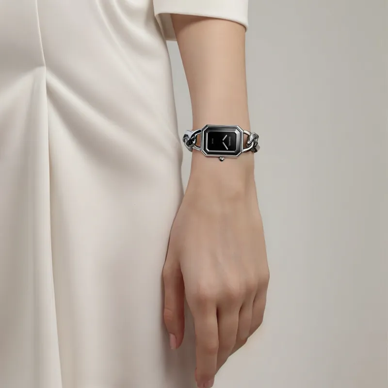 CHANEL Часы Première Gourmette Chain Модель Большого Размера, Сталь, Черный Циферблат