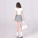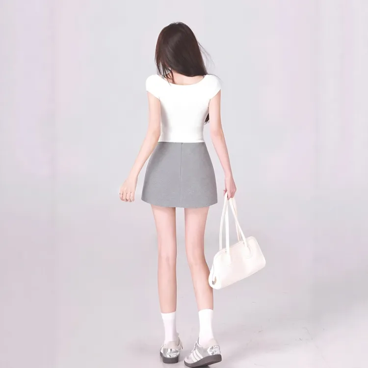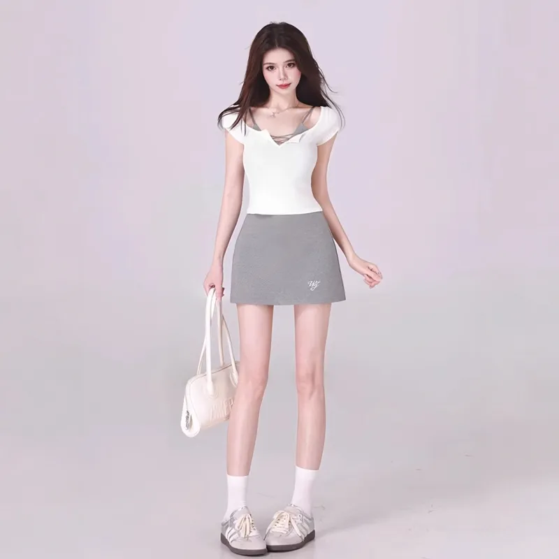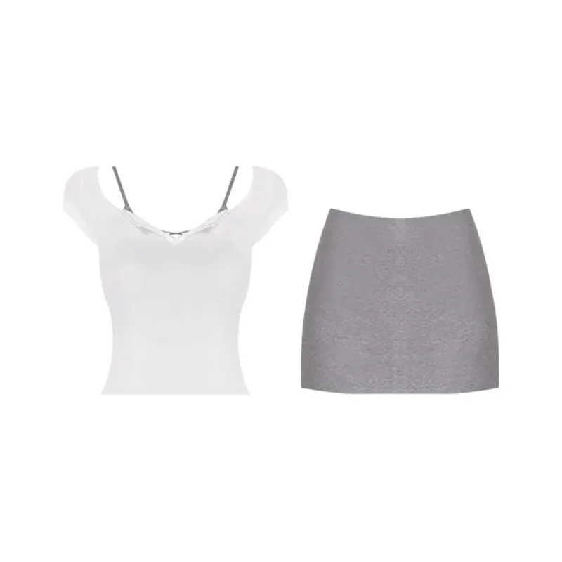 Белый топ + майка + серая юбка