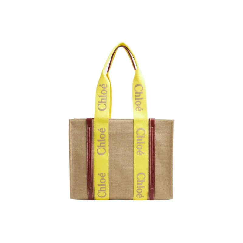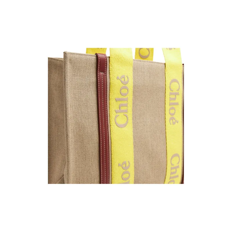 Chloe Woody Linen Canvas Calfskin Canvas Tote Bag Shopping Bag Medium Women's Yellow