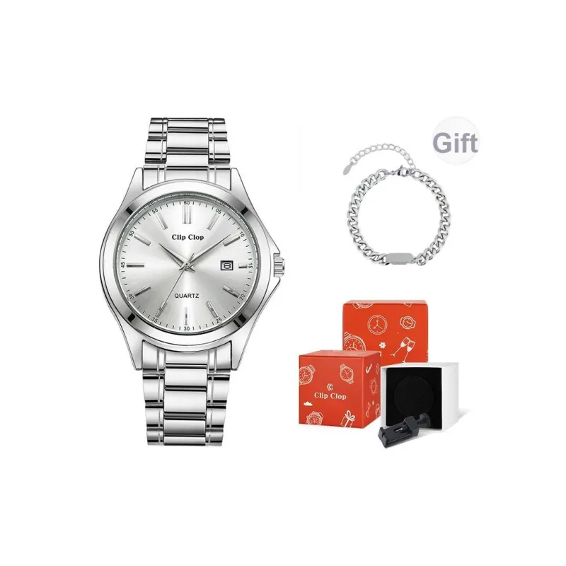 Комплект:Серебряный, полосатый, белый циферблат, оригинальная коробка + ожерелье + включает регулировщик часов