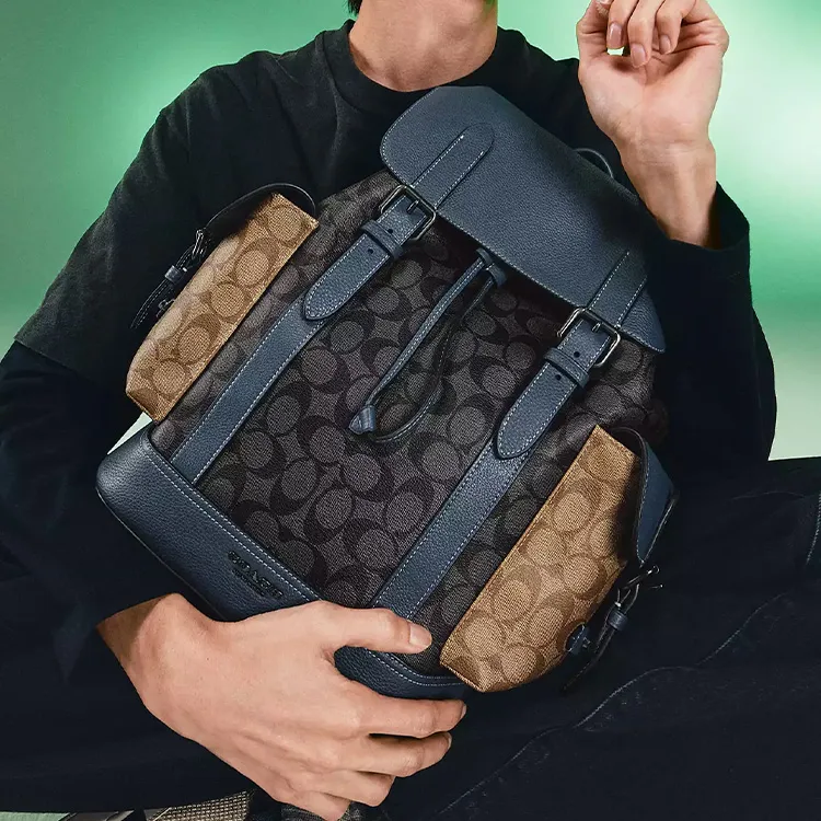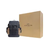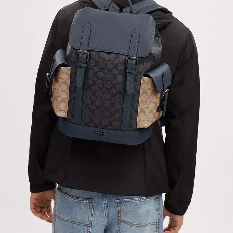 COACH Hudson Подпись Покрытый холст с кожаными вставками Рюкзак Большой Мужской Угольный серый и хаки и деним