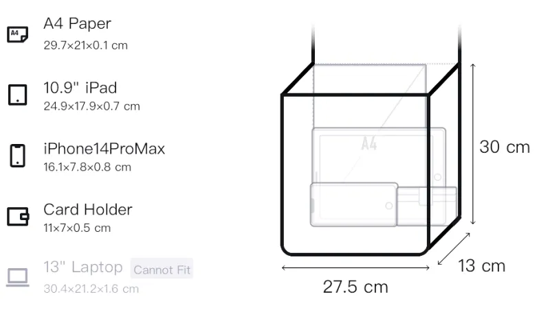 Длина (размер в длину) 30 см, Ширина 13 см, Рекомендуемая высота 27,5 см