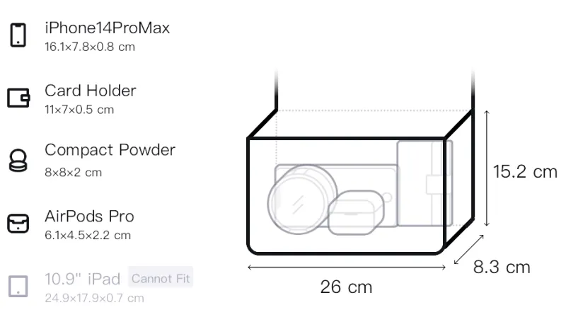 26 см в длину, 8,3 см в ширину, 15,24 см в высоту