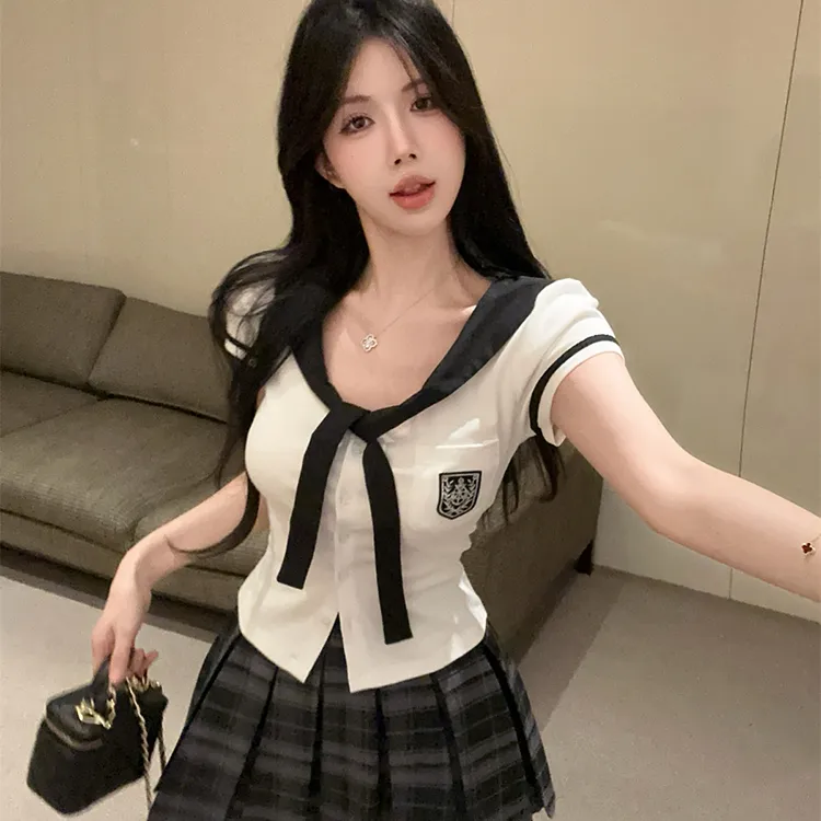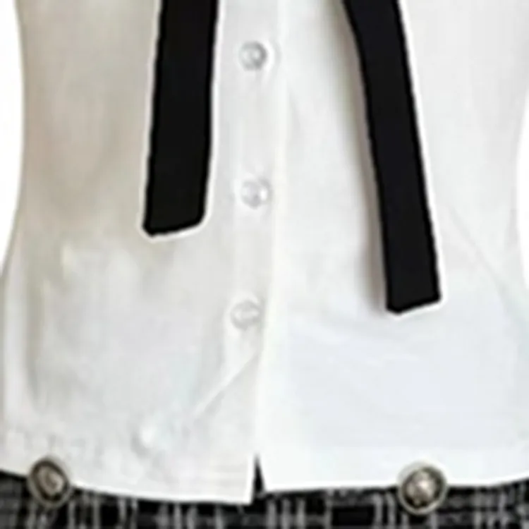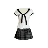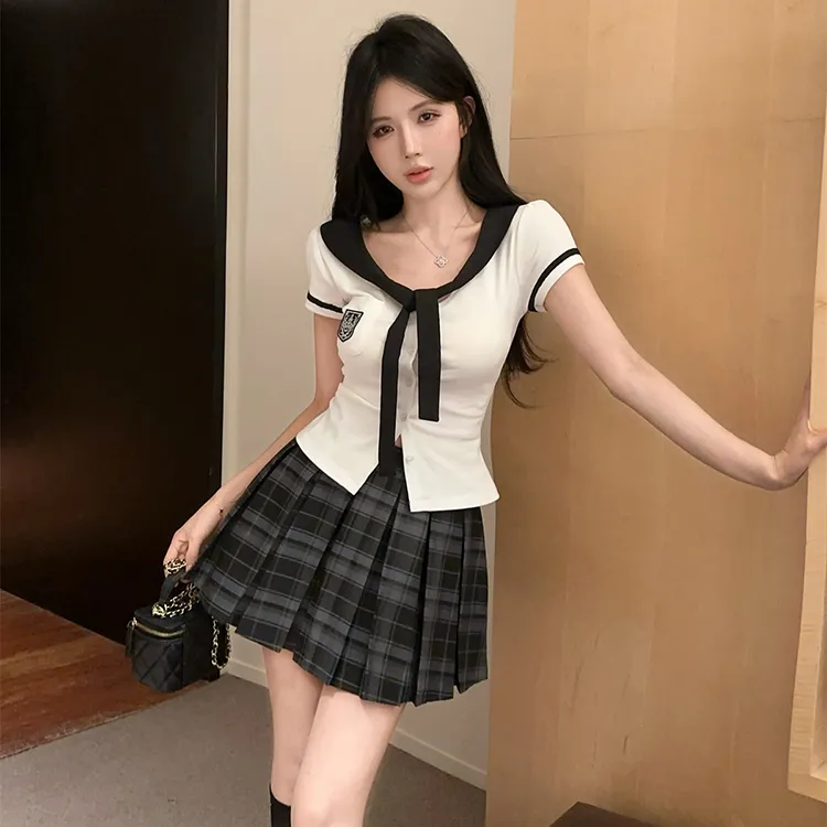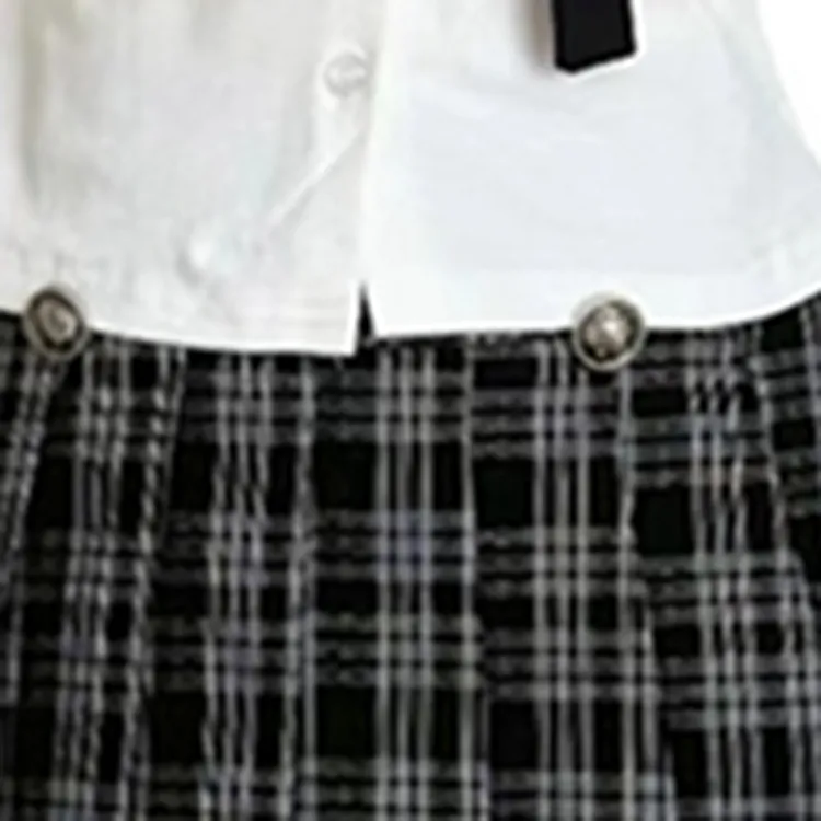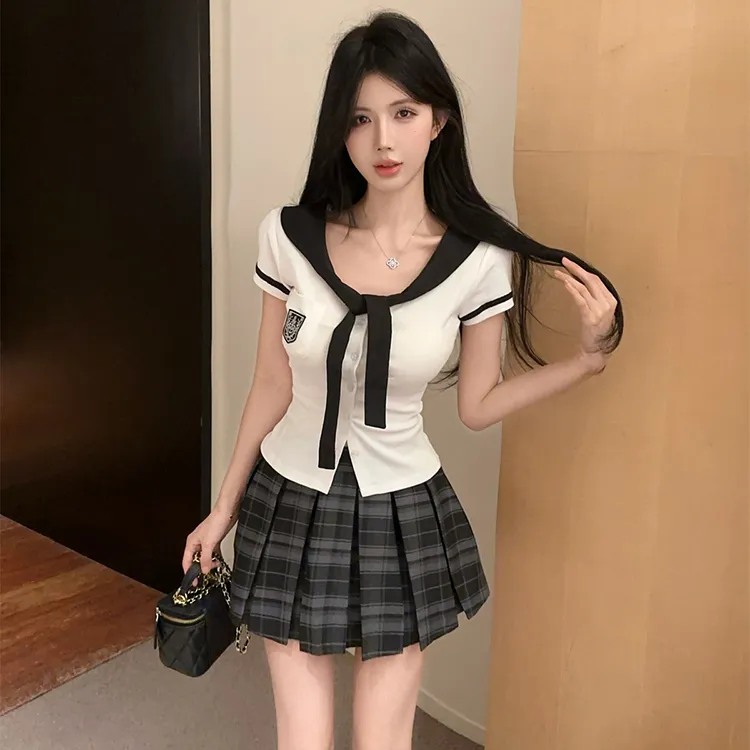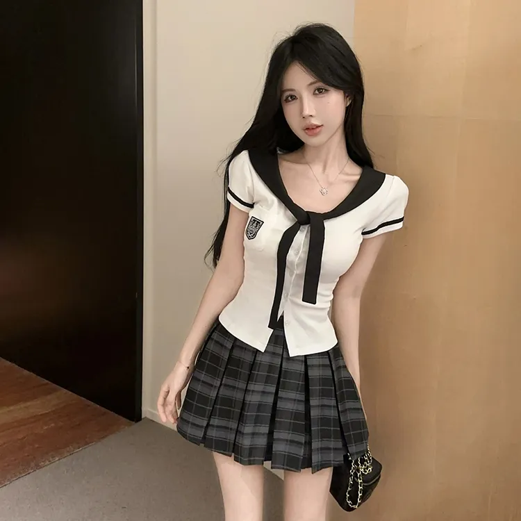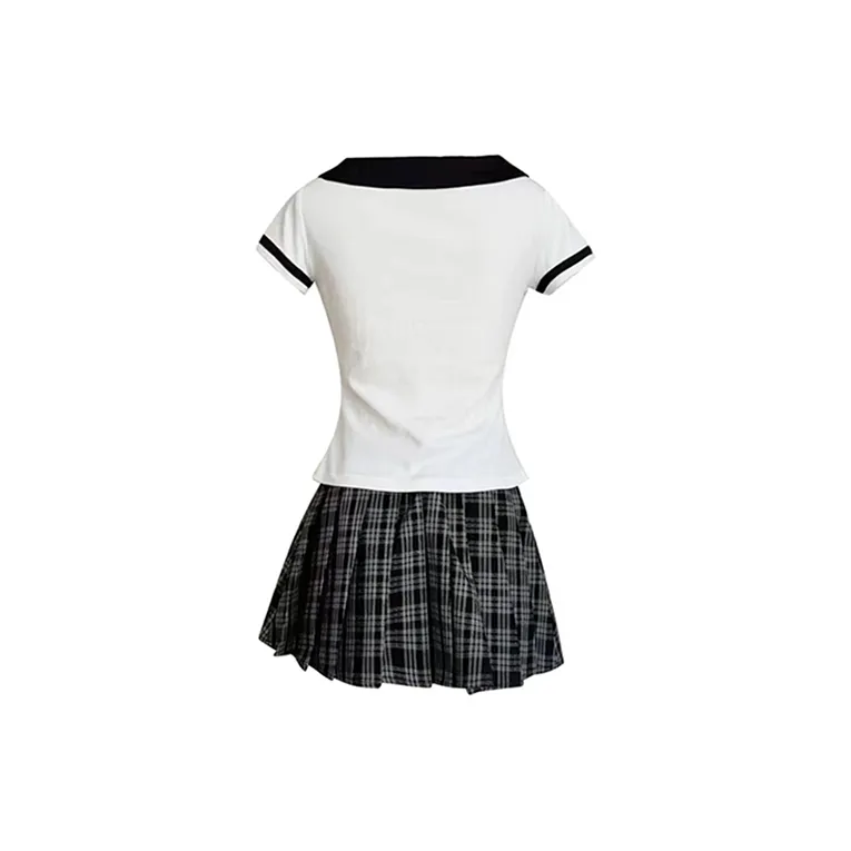 Комплект:Белый топ + Серая клетчатая короткая юбка