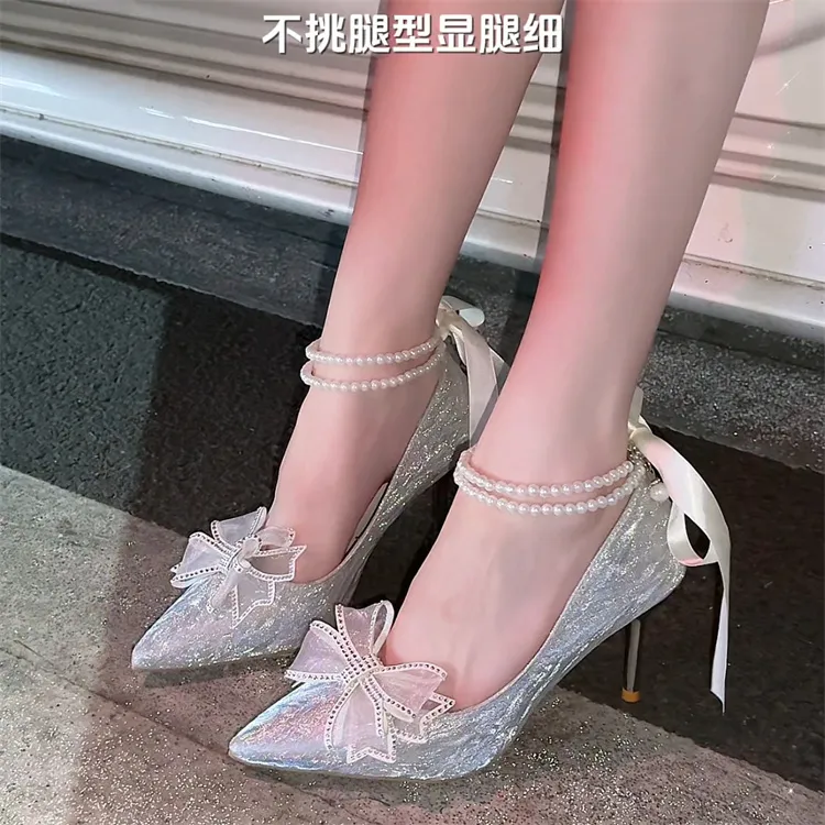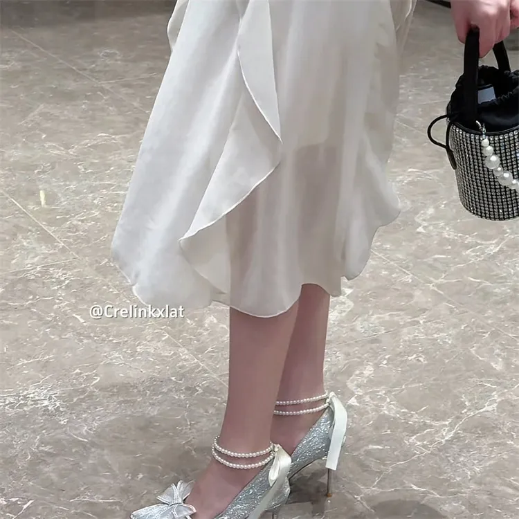 Crelinkxlat Pearl Butterfly Chain French Fairy Soft Low Heel High Heel Women's