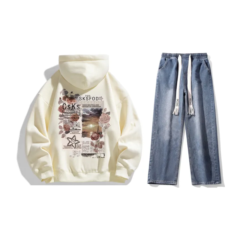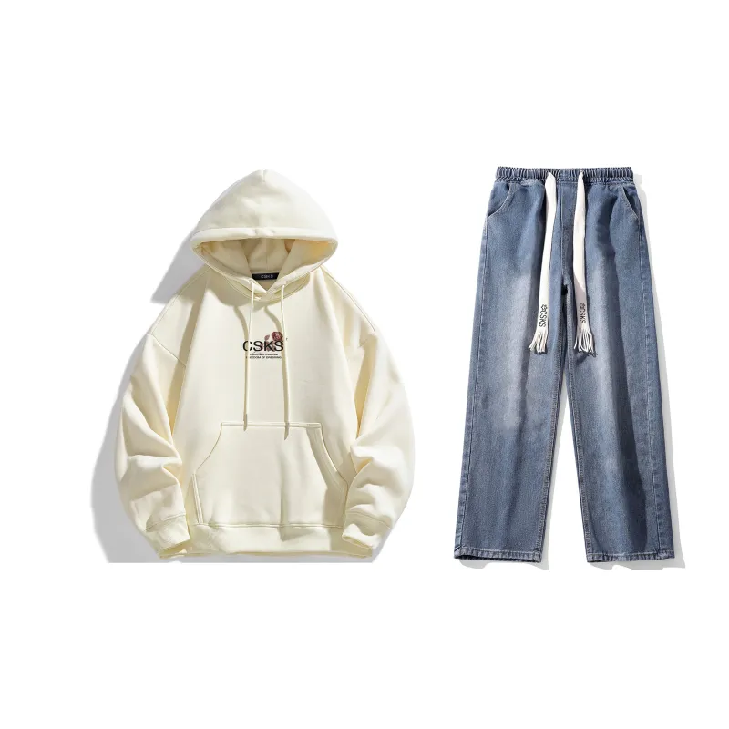 Комплект одежды (Светлый кофейный свитшот + Темно-синие джинсы с эффектом вымытого ткани) (На флисовой подкладке)