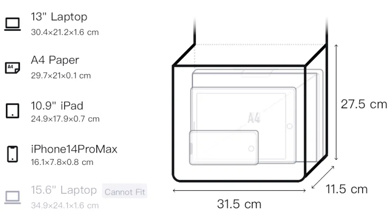 Верх (одежда): длина 36,5 см, низ: длина 31,5 см, ширина 11,5 см, рекомендуемая высота: 27,5 см