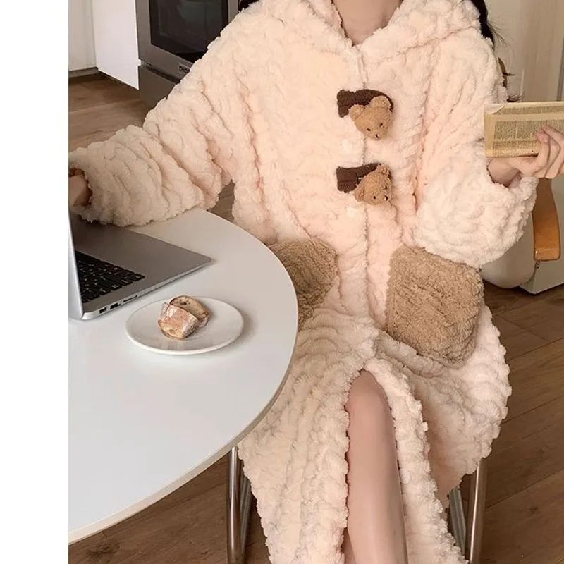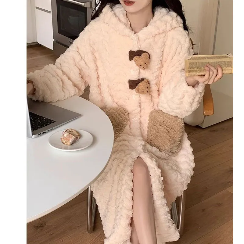 Dippanis Сладкий стиль С капюшоном Пуговицы Медведь Женские Халаты для ванной