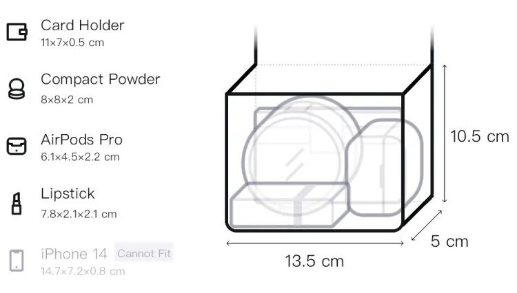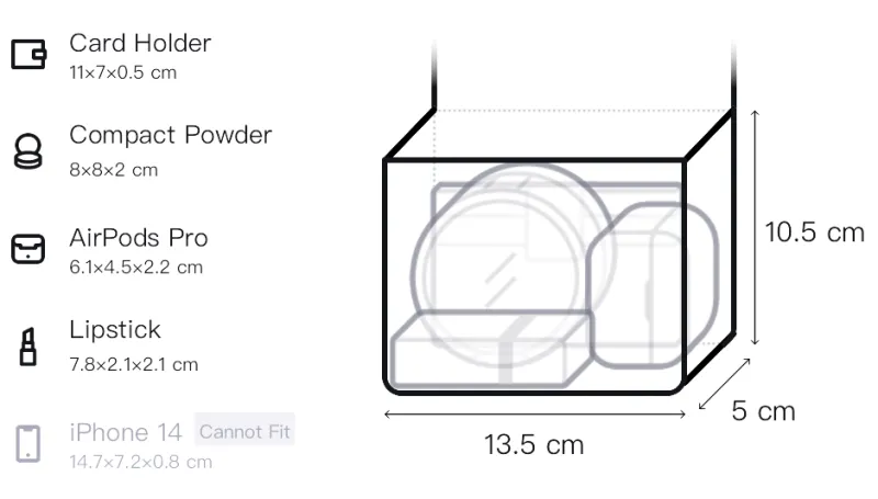 Верхняя длина (размер в длину): 16,5 см, Нижняя длина: 13,5 см, Ширина корпуса: 5 см, Длина корпуса: 10,5 см