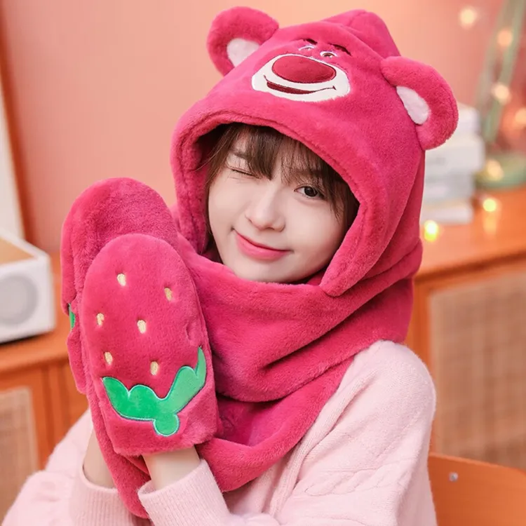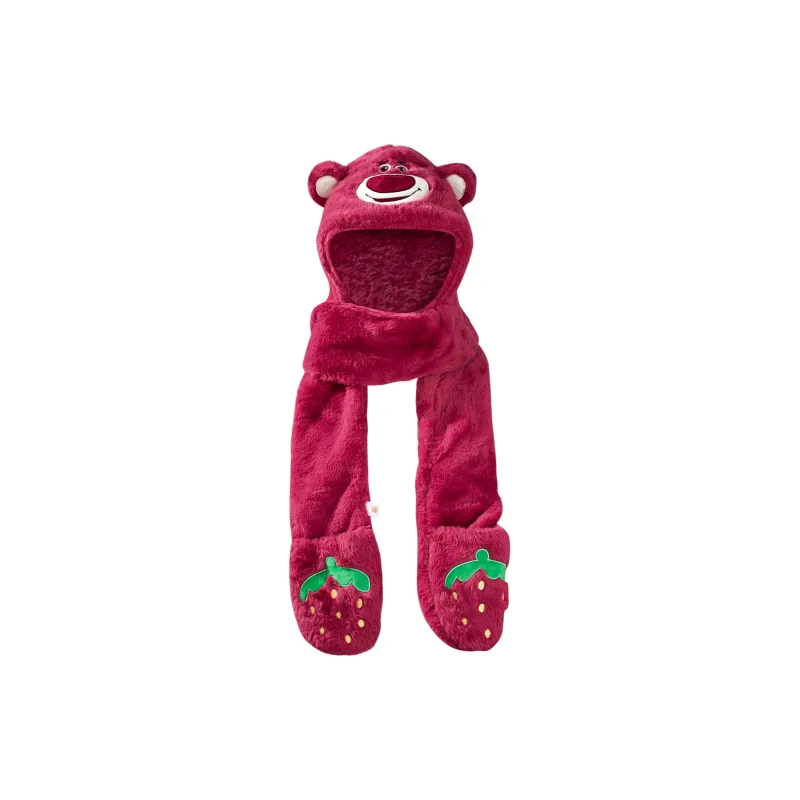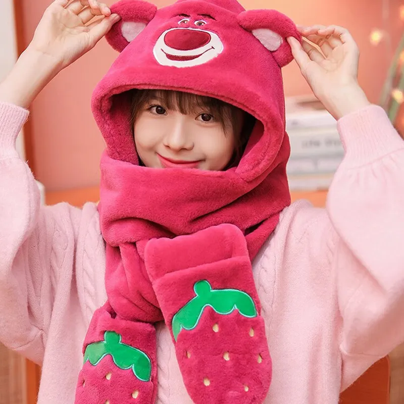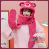 Disney Strawberry Bear Series Плоская подошва Шапки Кепки Шарф Перчатки 3 в 1 Тело Трёхкомпонентный комплект Капюшоны и плюшевые шапки Женские