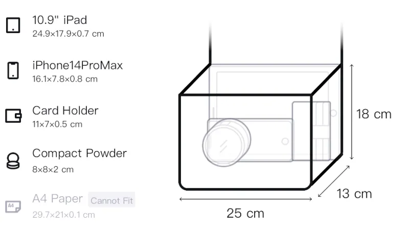 Верхняя длина (размер в длину): 38 см, нижняя длина: 25 см, ширина корпуса: 13 см, длина корпуса: 18 см
