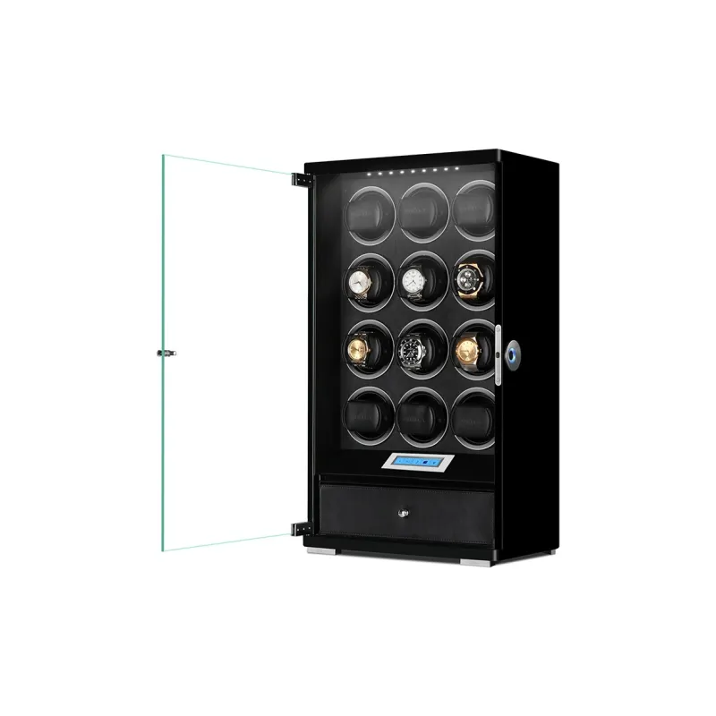 Двенадцать отделений для часов - Черный, покрытие из эмали, Piano + Красная кожа + Коробка + Замковая система распознавания отпечатков пальцев