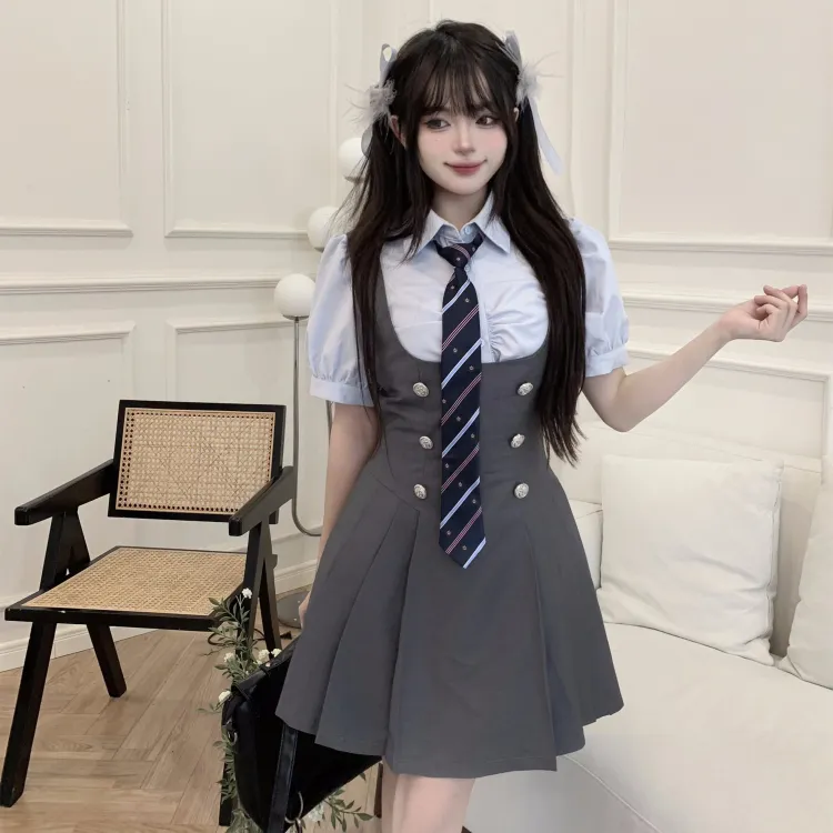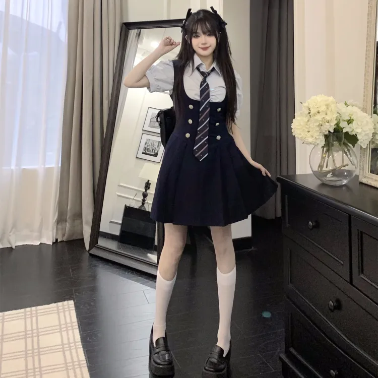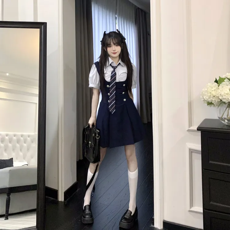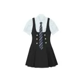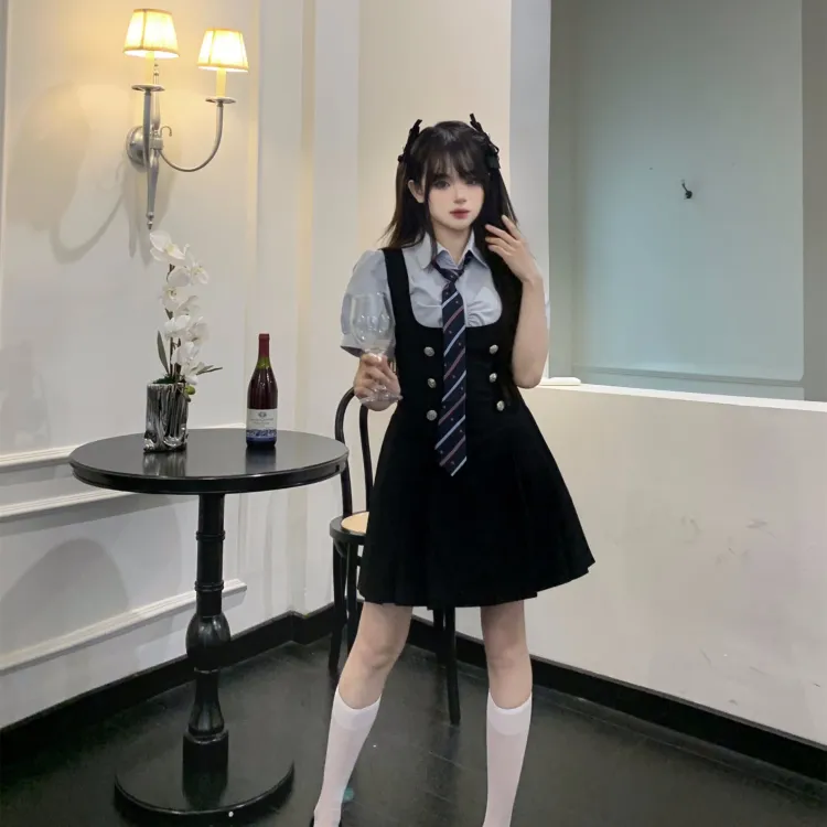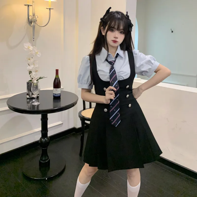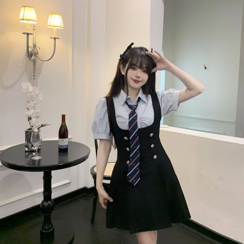 Комплект:Комплект (Синяя рубашка с коротким рукавом + черная юбка с поясом + синий галстук)